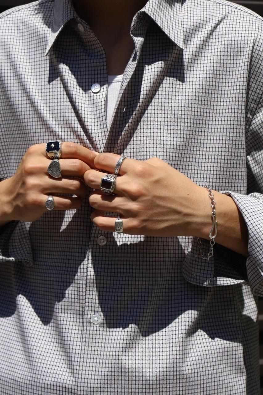 素材には主にシルバーと真鍮を用いた作品が多く、過度にギラギラとさせない、さりげなく身につけられる鈍い輝きがLHN JEWELRYの魅力です。