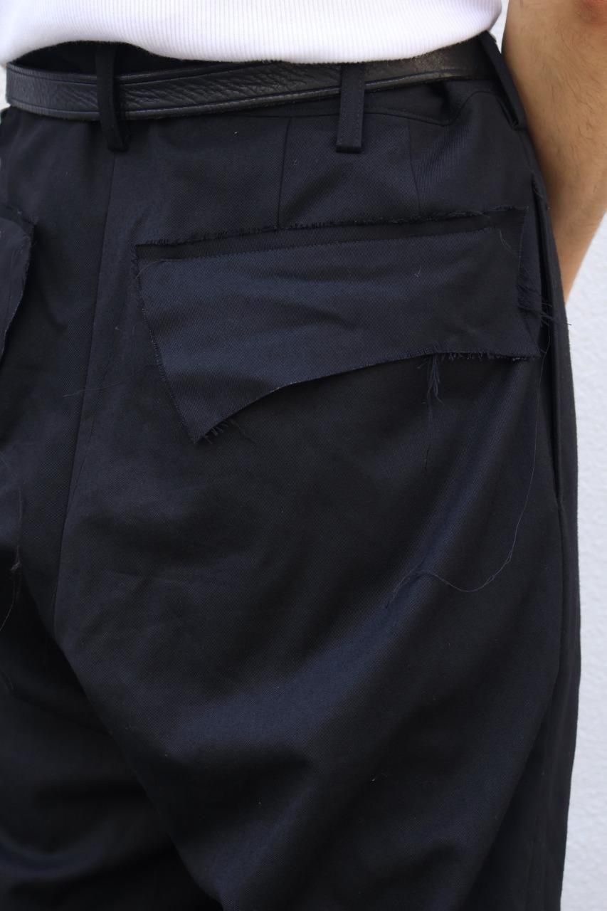 背面には断ち切りのフラップポケットをあしらい、無造作に垂れる糸端が静かなアクセントを添えます。