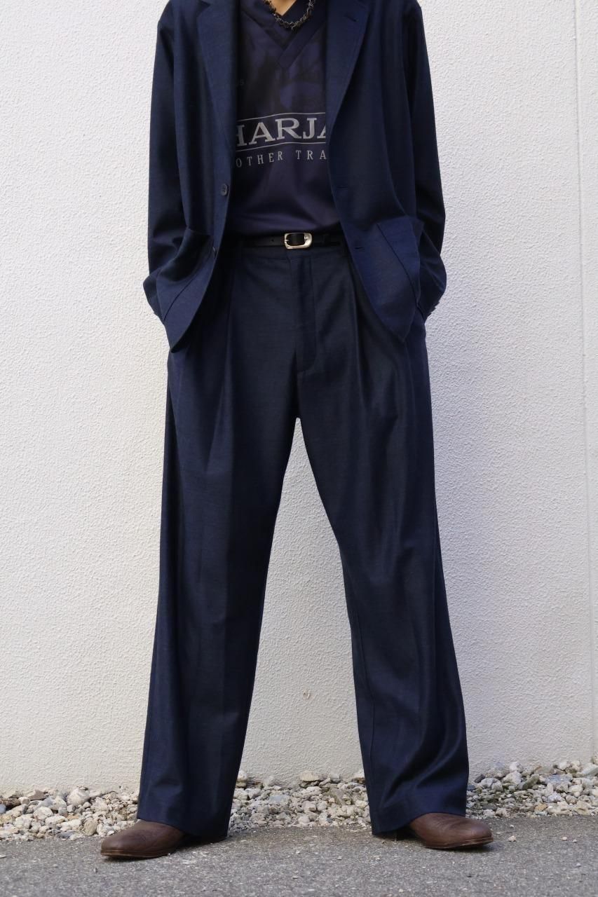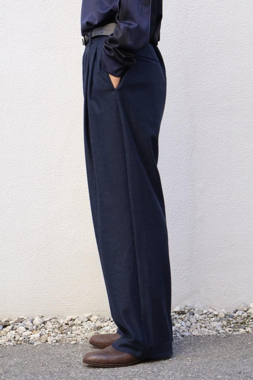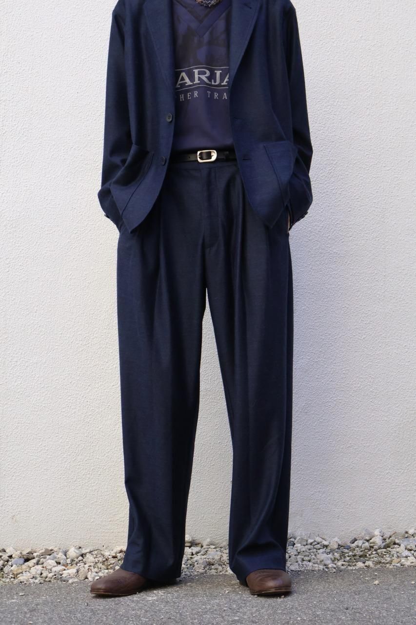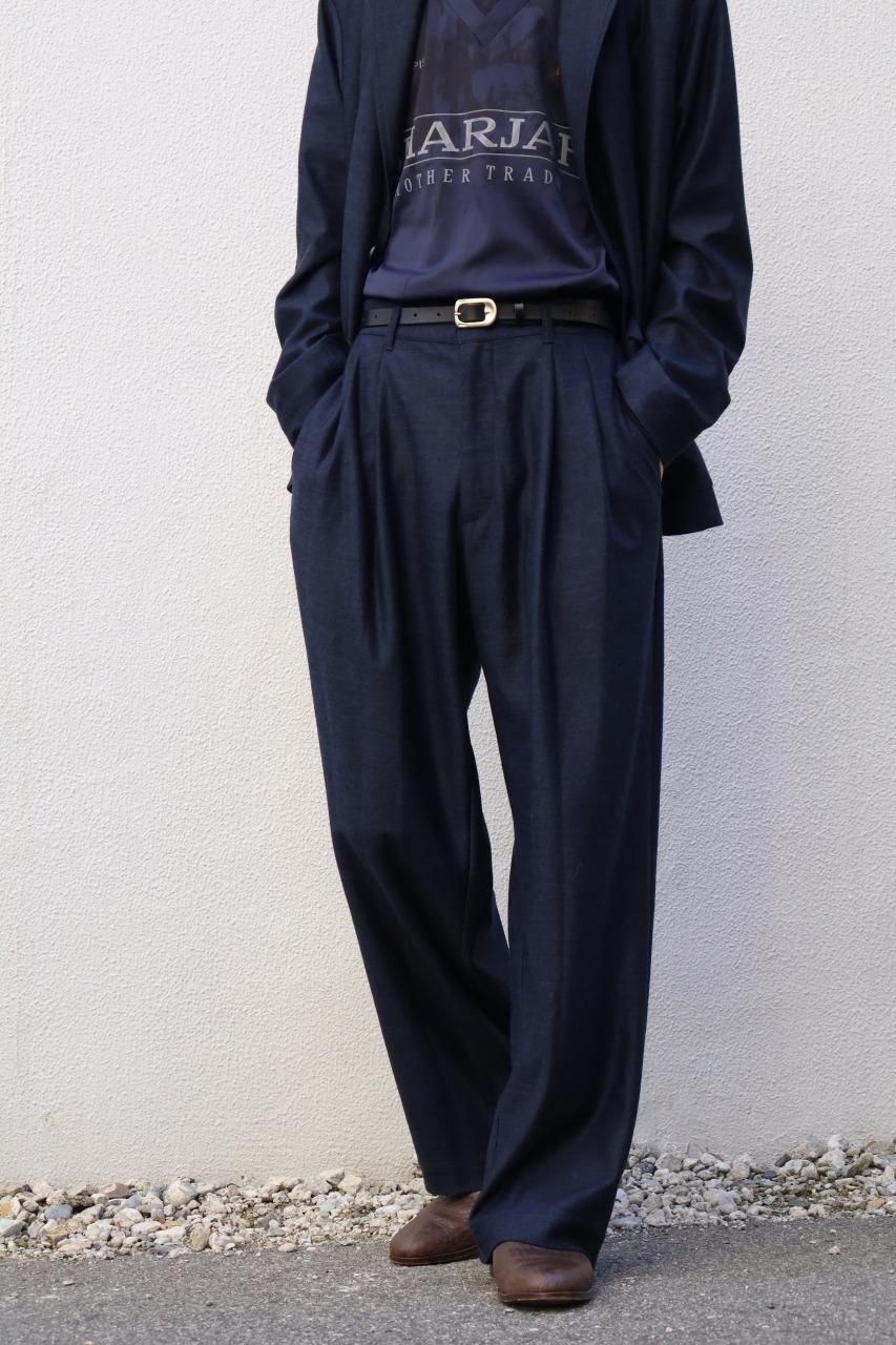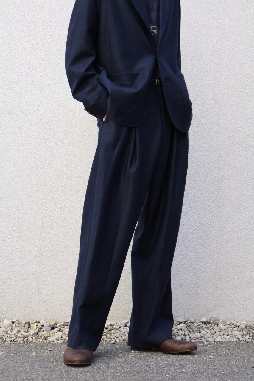 タックが深く入ったスラックスで、わたりを程よくとり、軽くテーパードをかけたシルエットが特徴です。