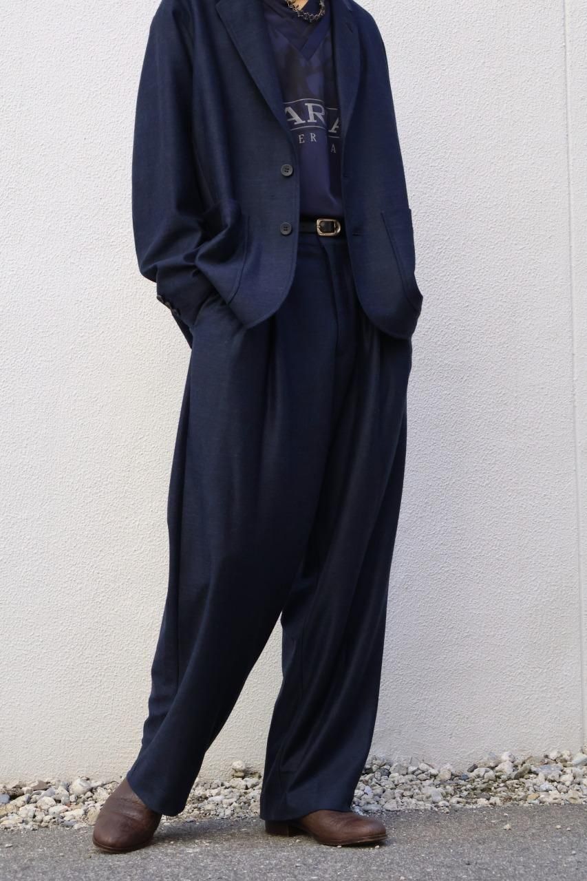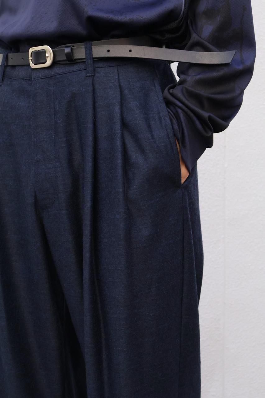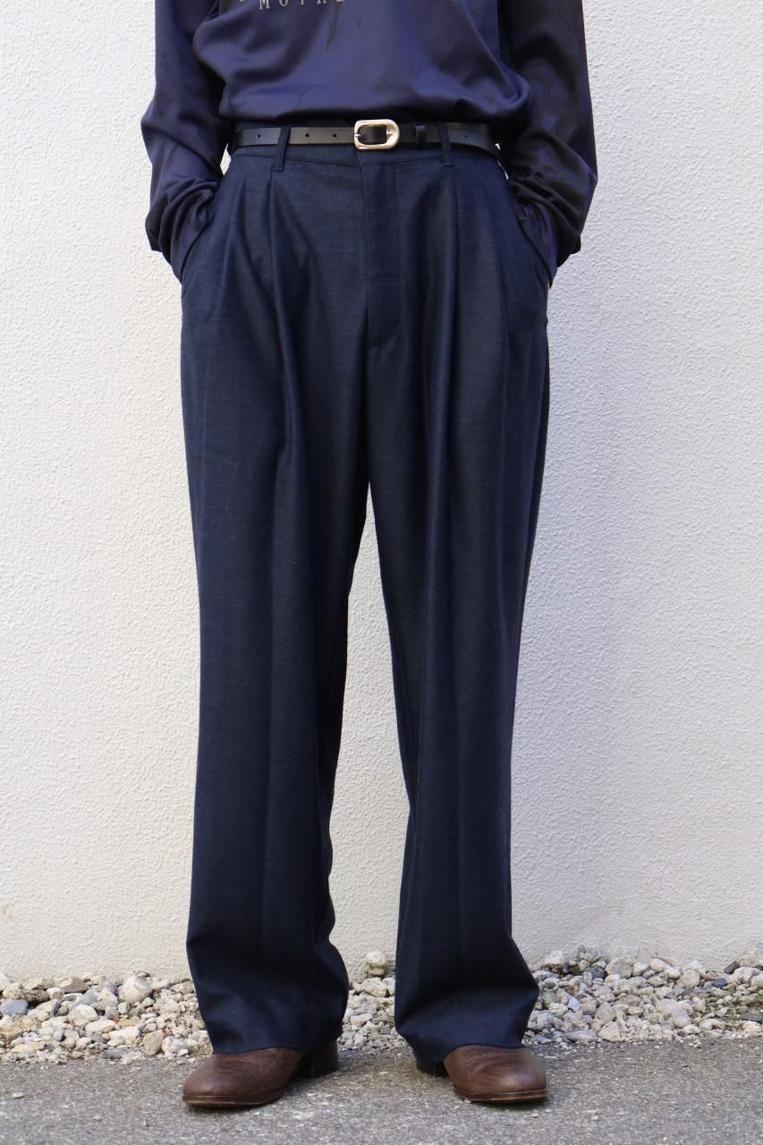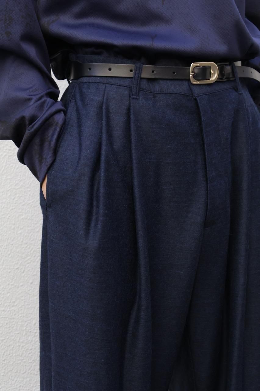 タックが深く入ったスラックスで、わたりを程よくとり、軽くテーパードをかけたシルエットが特徴です。