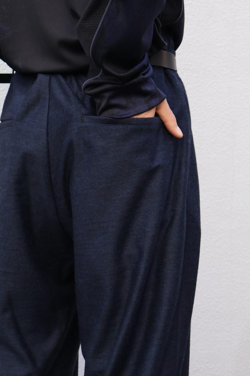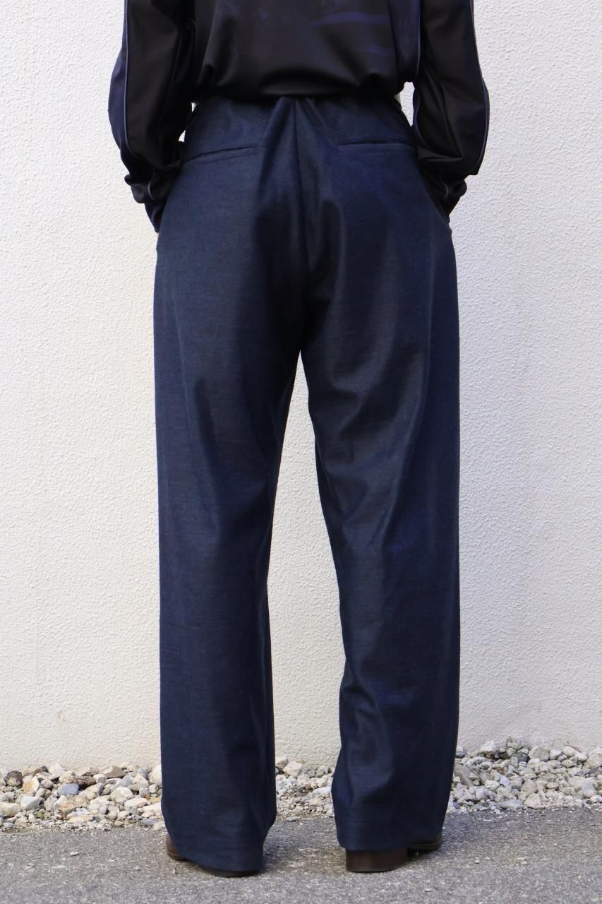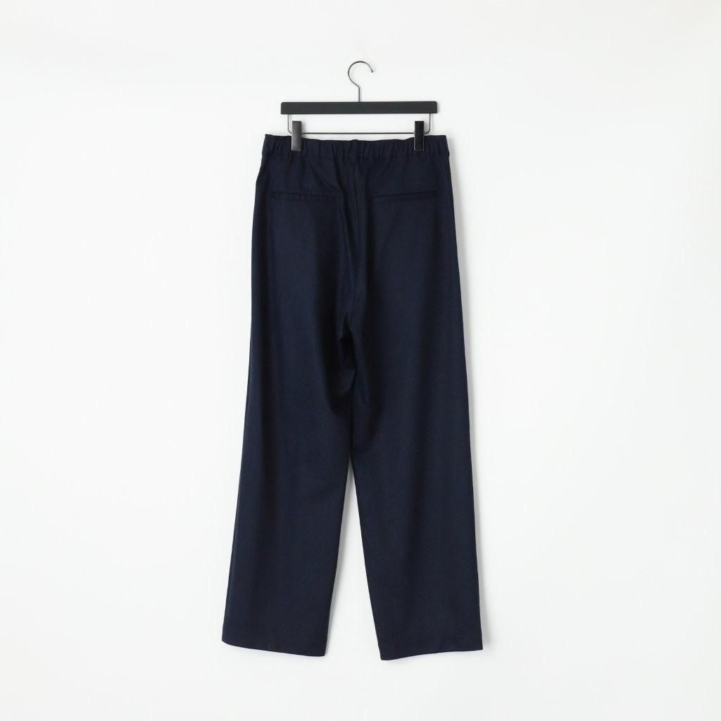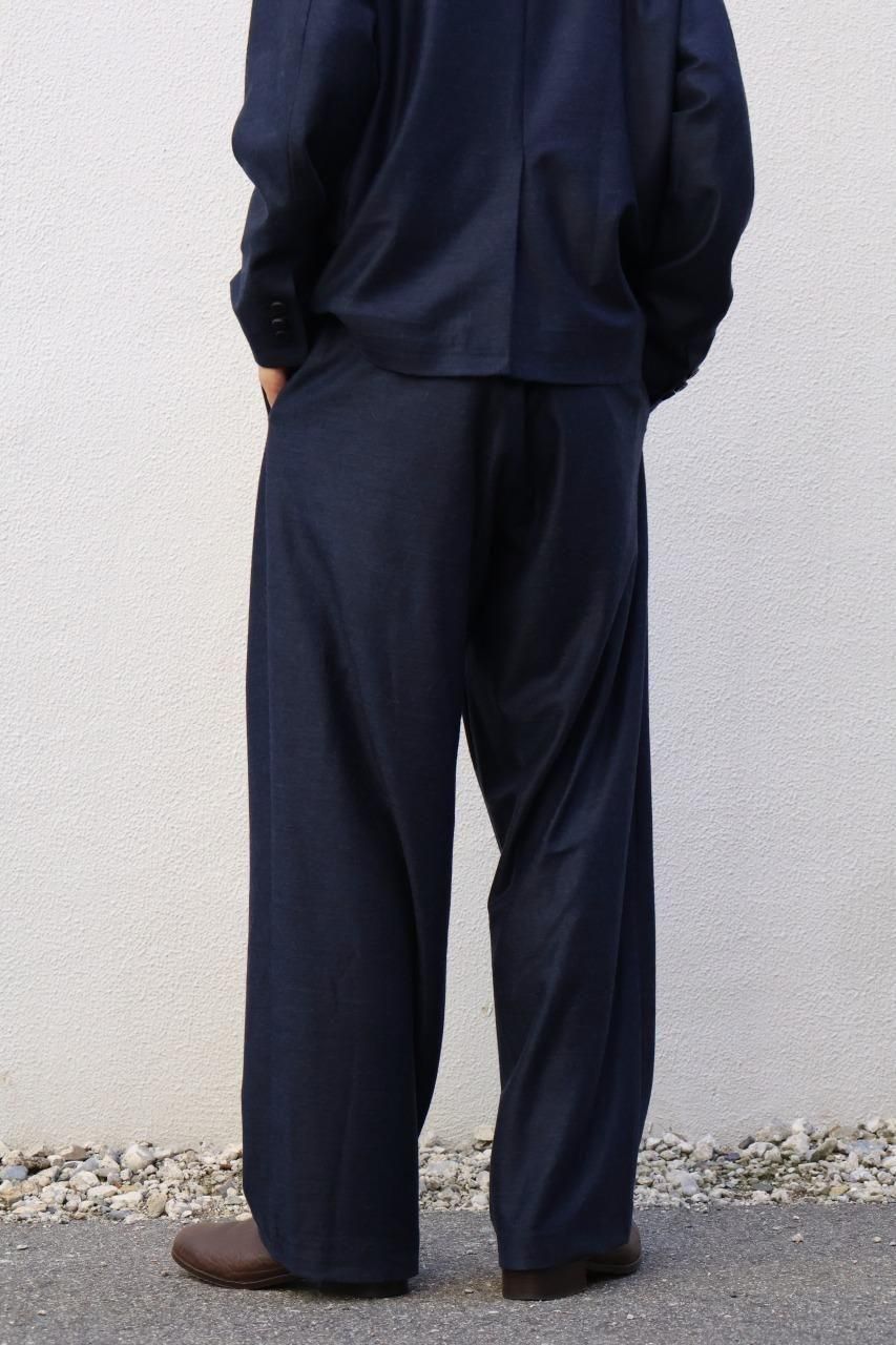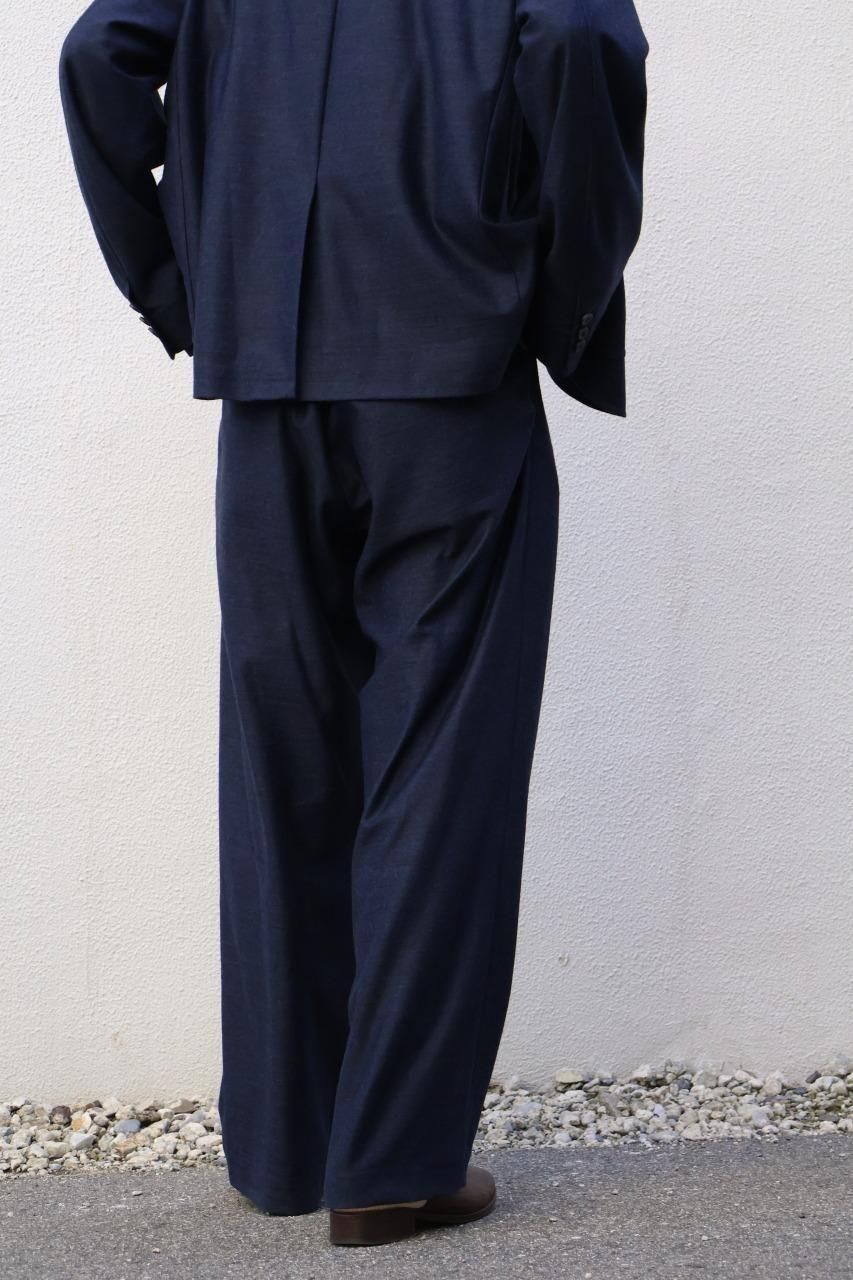 タックが深く入ったスラックスで、わたりを程よくとり、軽くテーパードをかけたシルエットが特徴です。