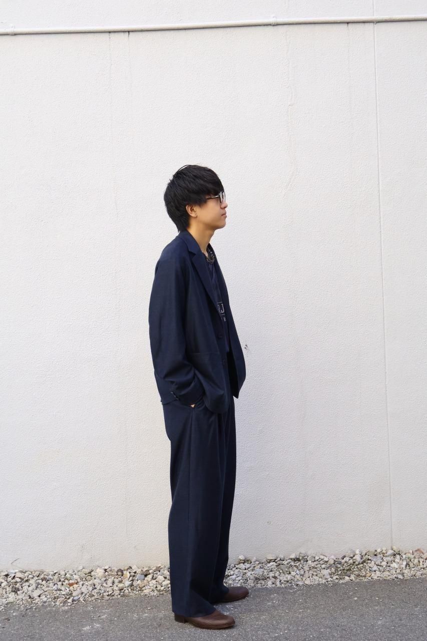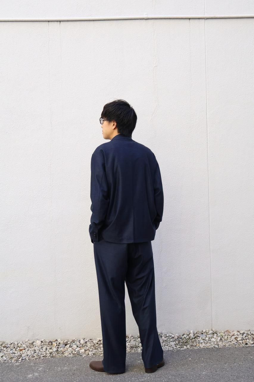 モヘアのハリ感による、しわなどの形態変化も少なく、イージーケア性、そして光沢感と程よい毛羽感が特徴的で、ストレッチ性が高く一度着ると止められない着心地。