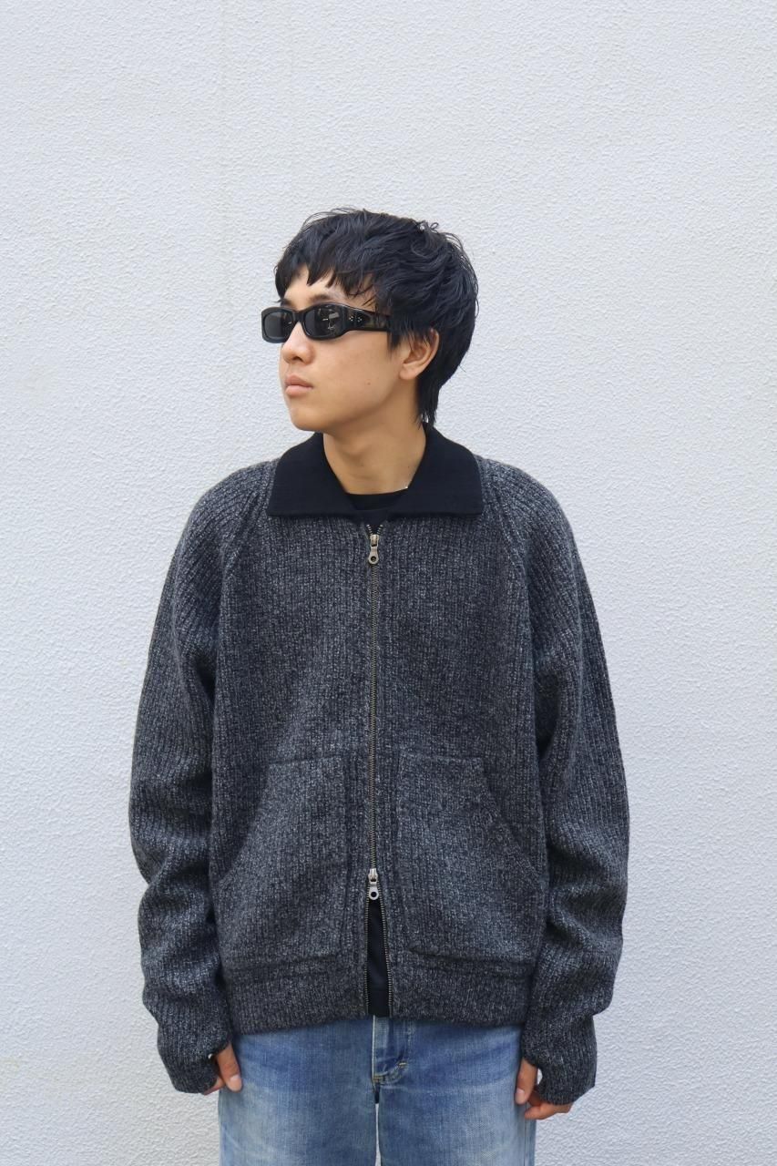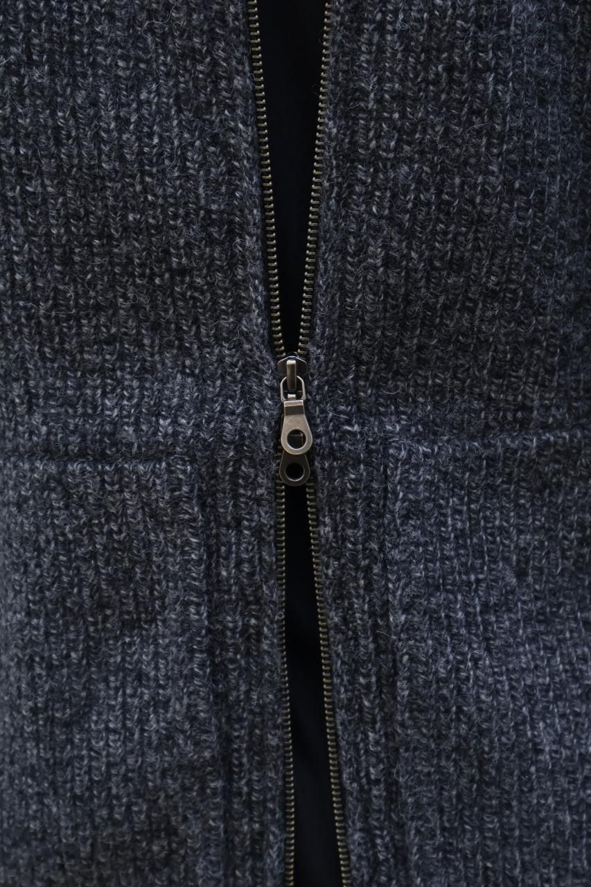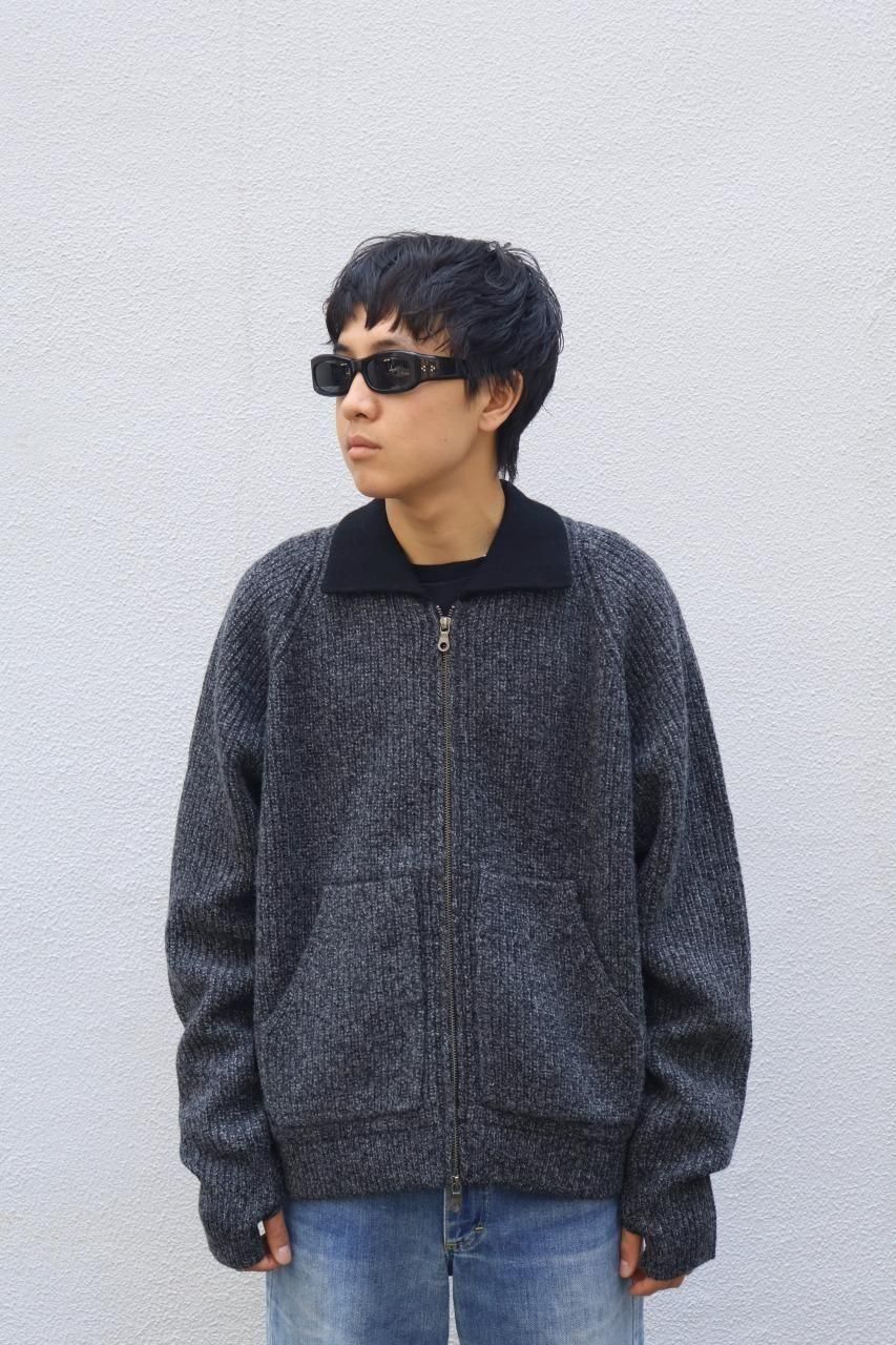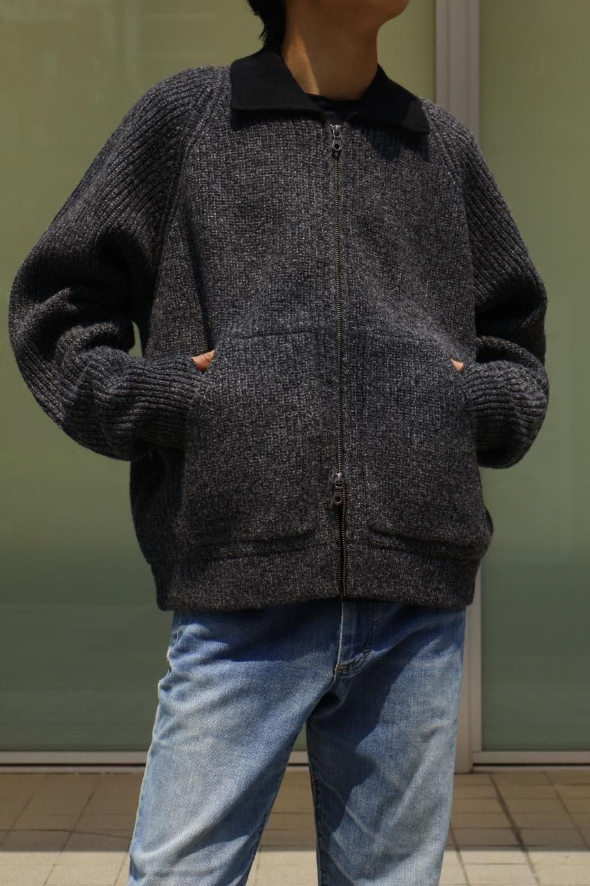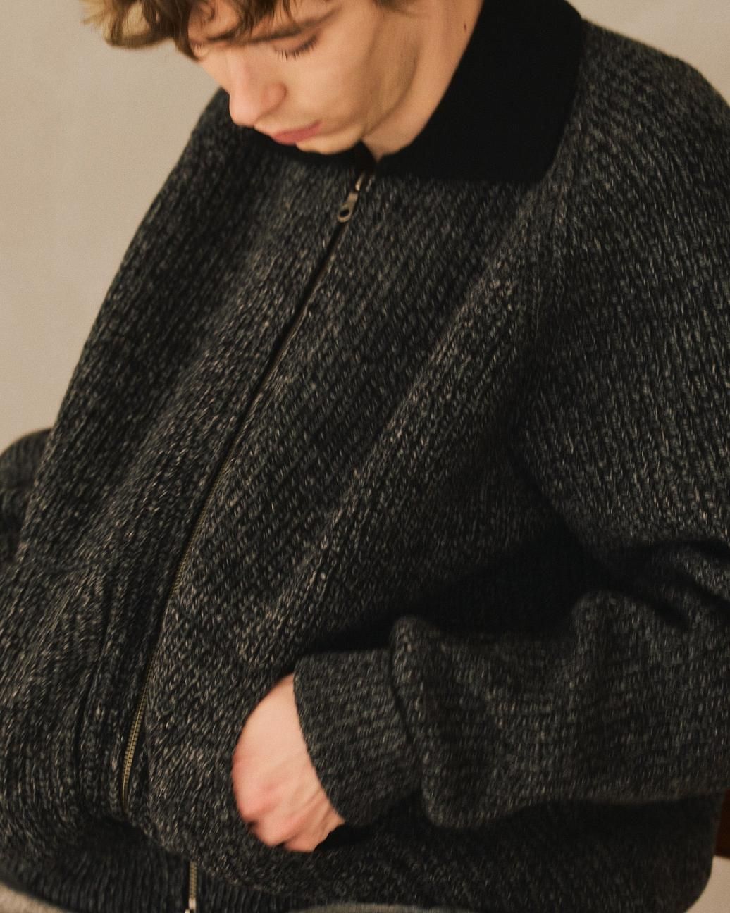 ラムウールのメランジ糸を使用した畦編みのニットブルゾン。