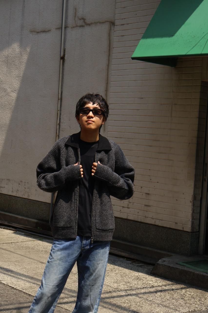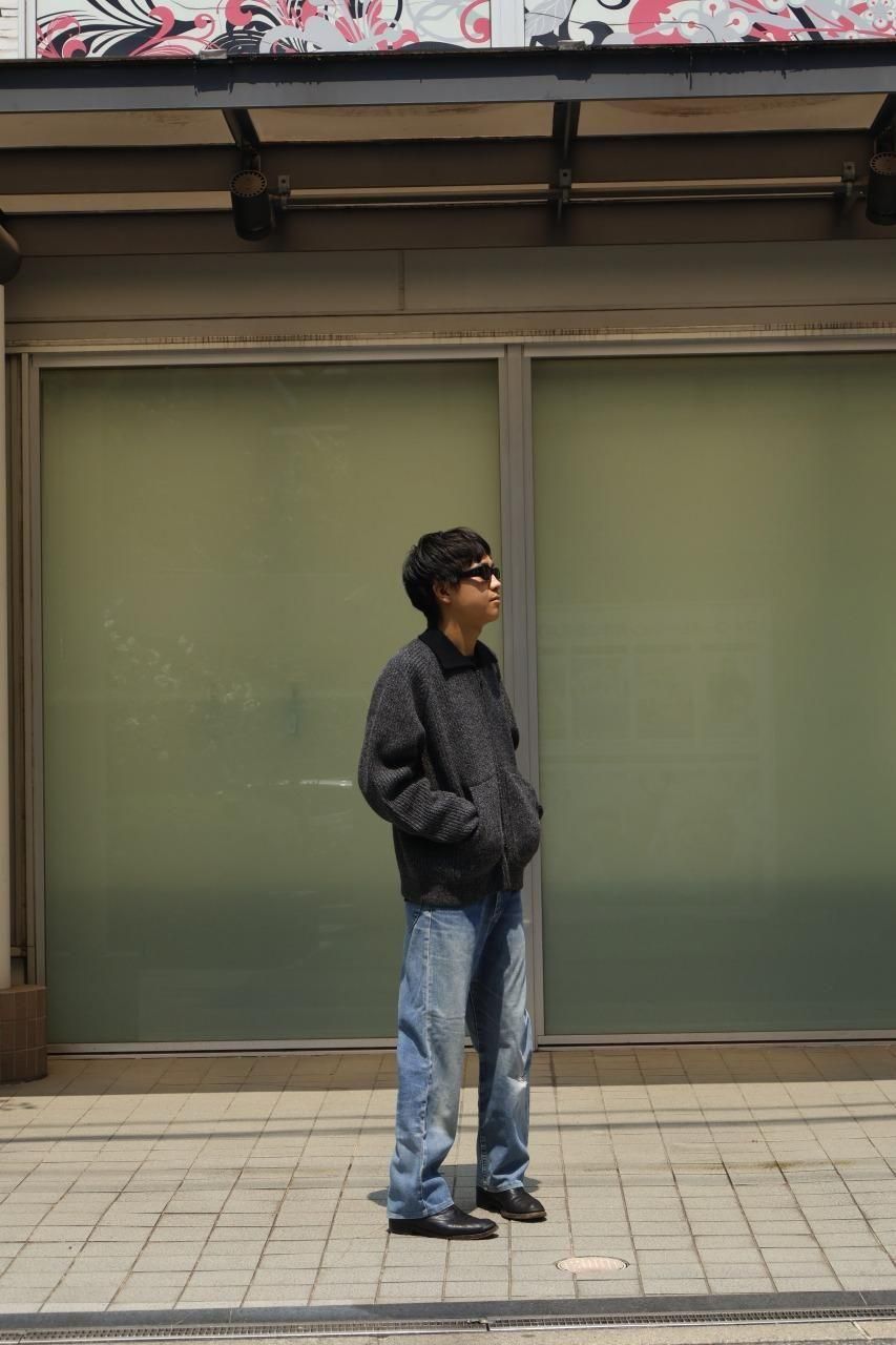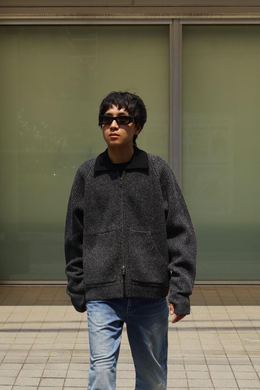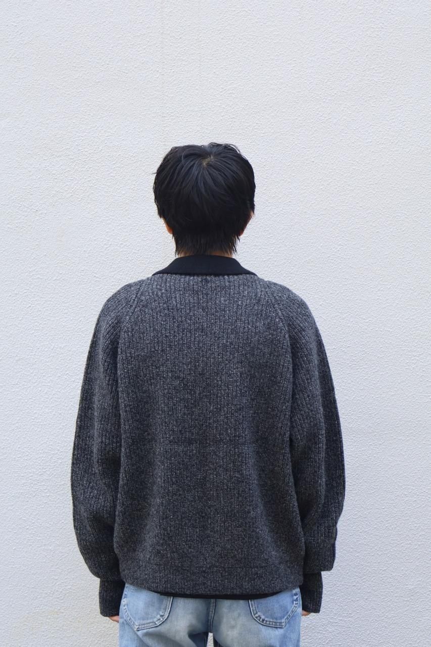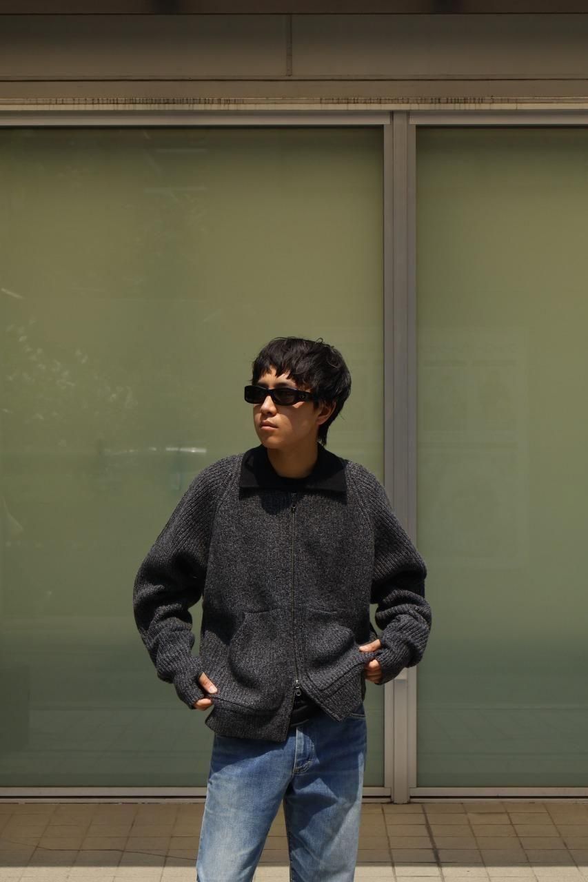 ラムウールのメランジ糸を使用した畦編みのニットブルゾン。