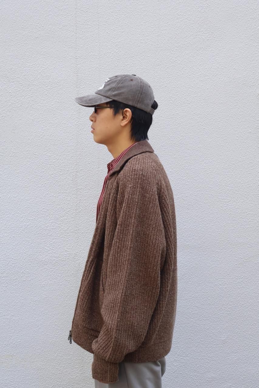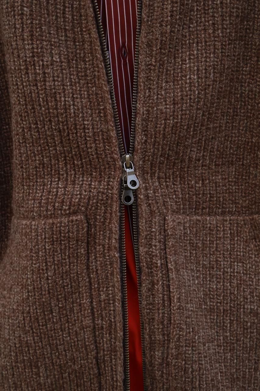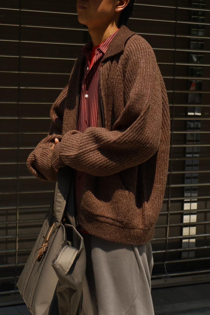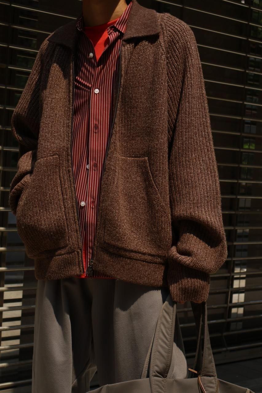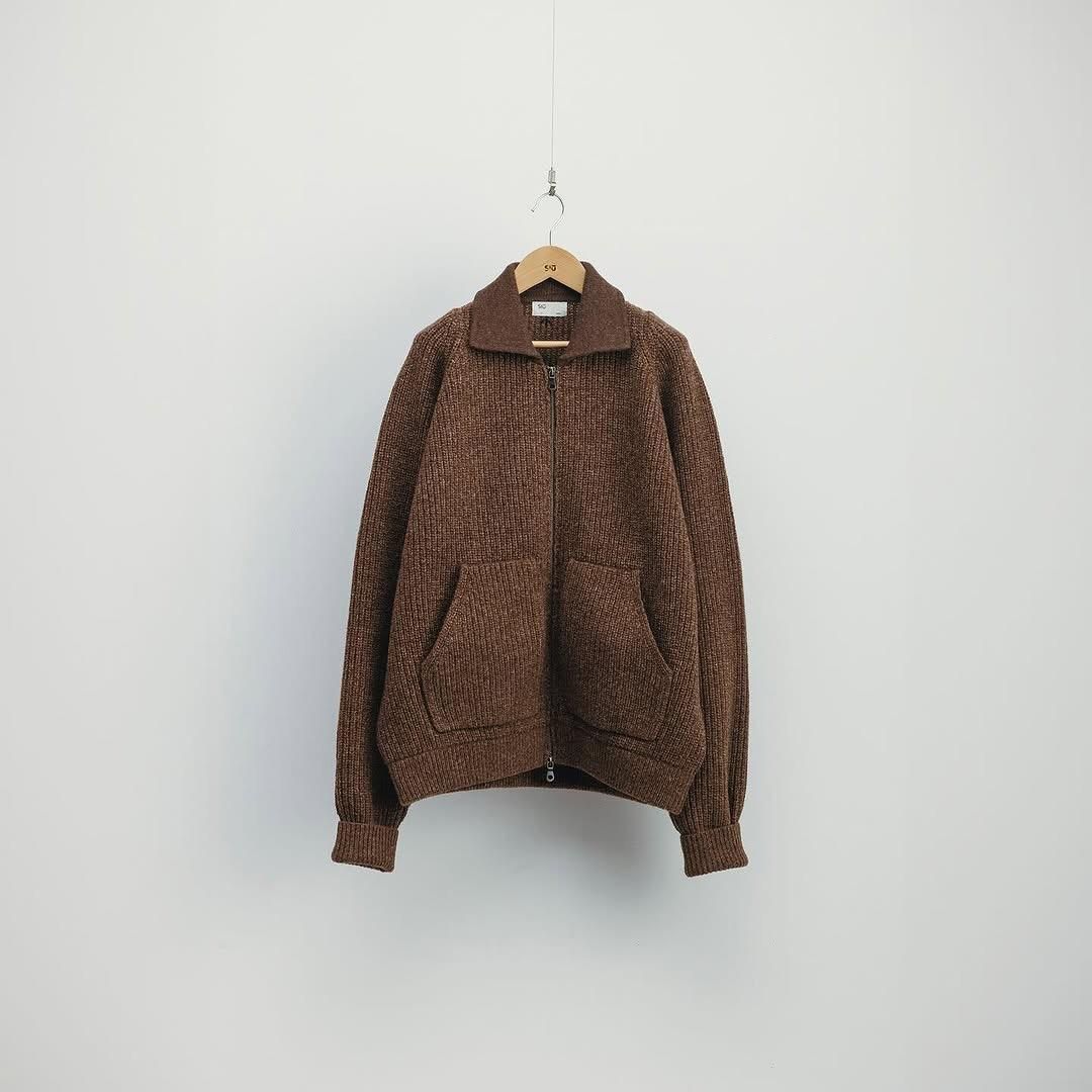 ラムウールのメランジ糸を使用した畦編みのニットブルゾン。