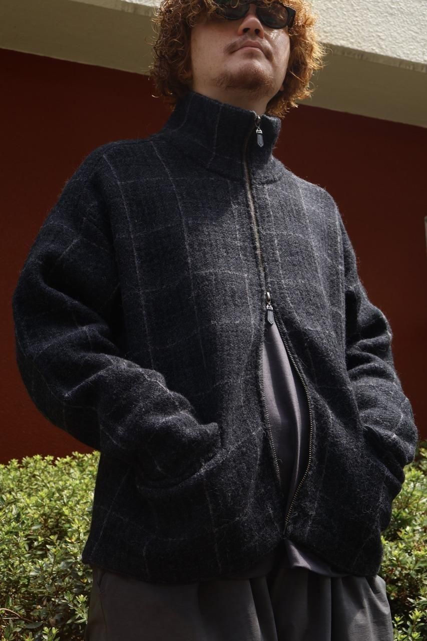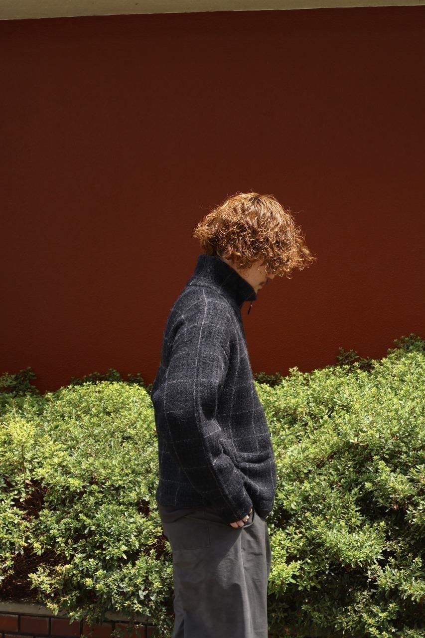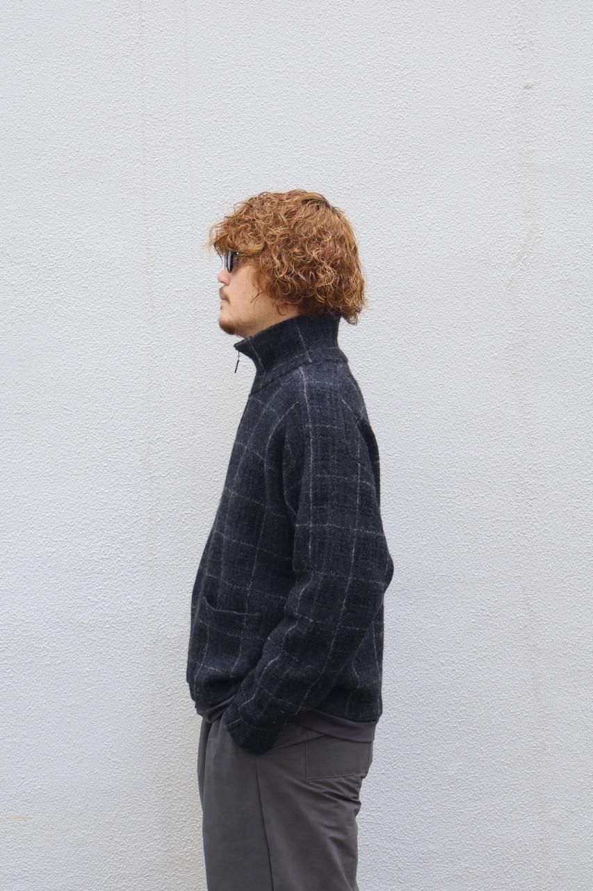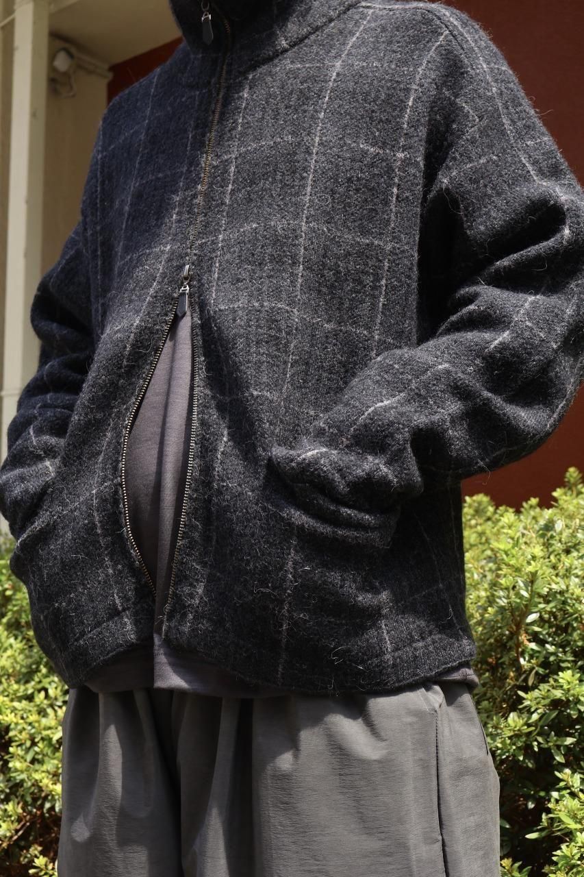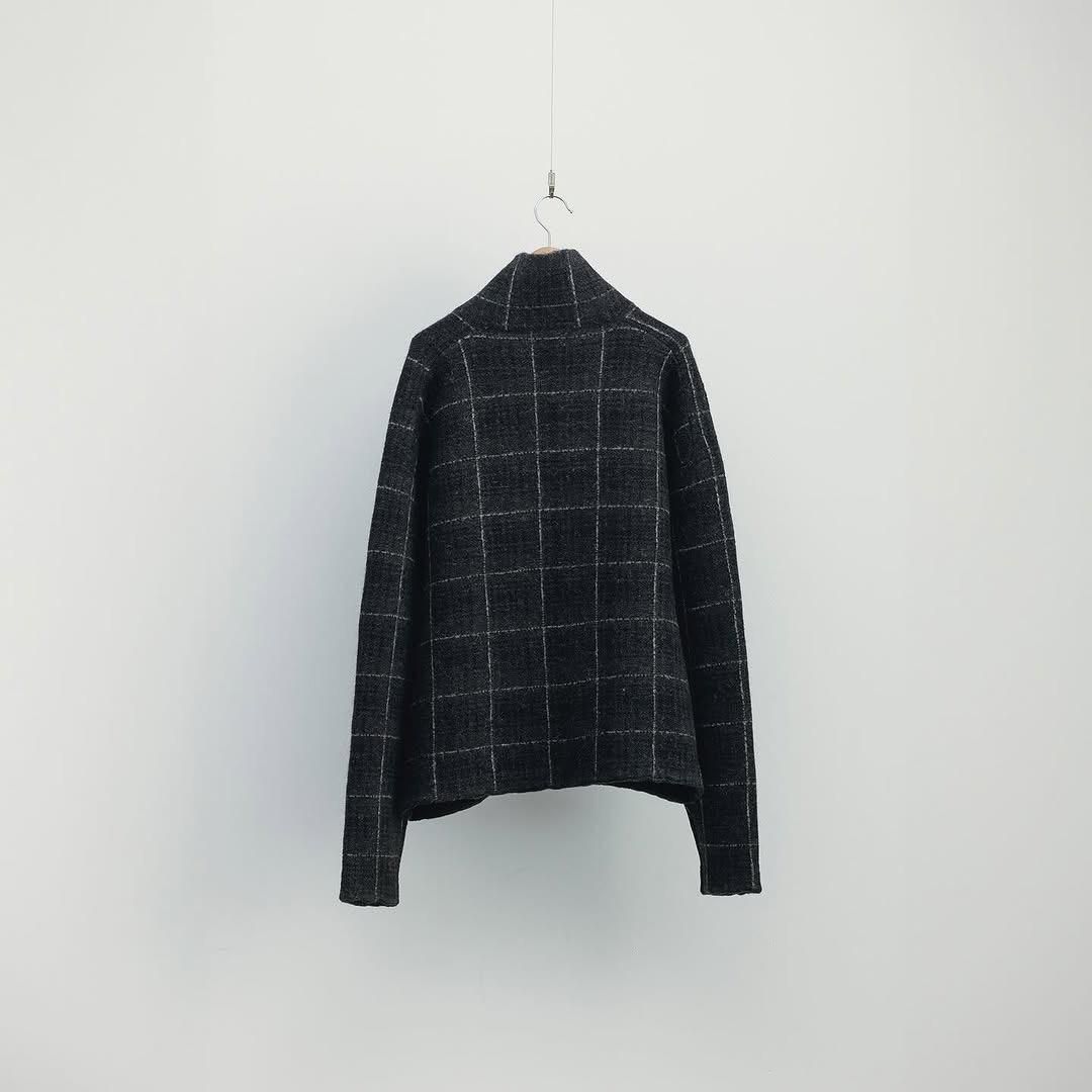 チェック柄のジャガードニットをドライバーズ型に仕立てました。