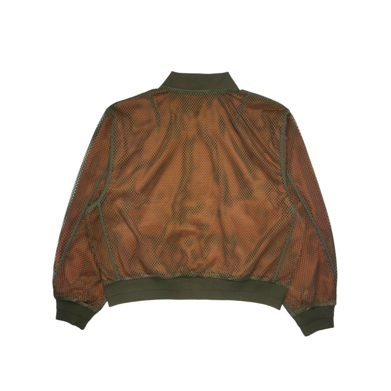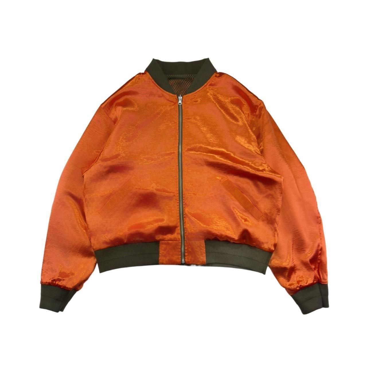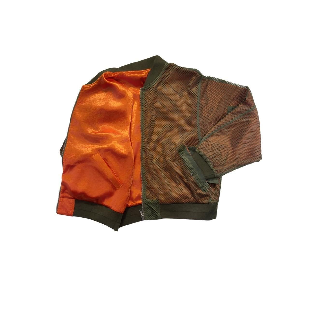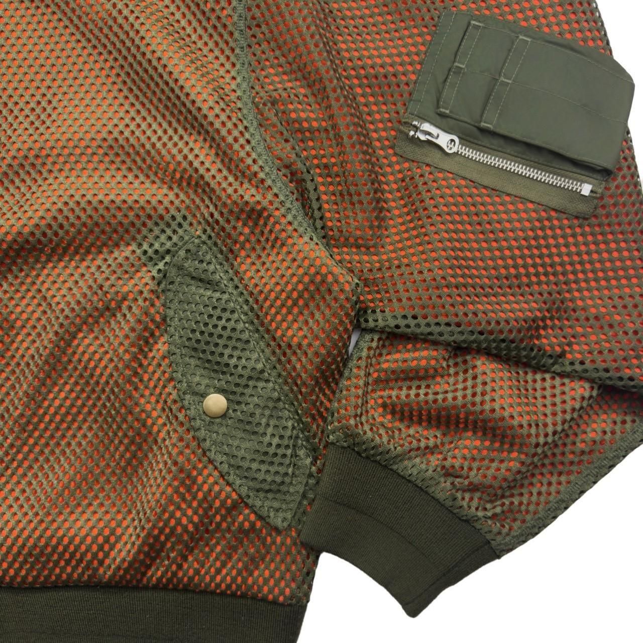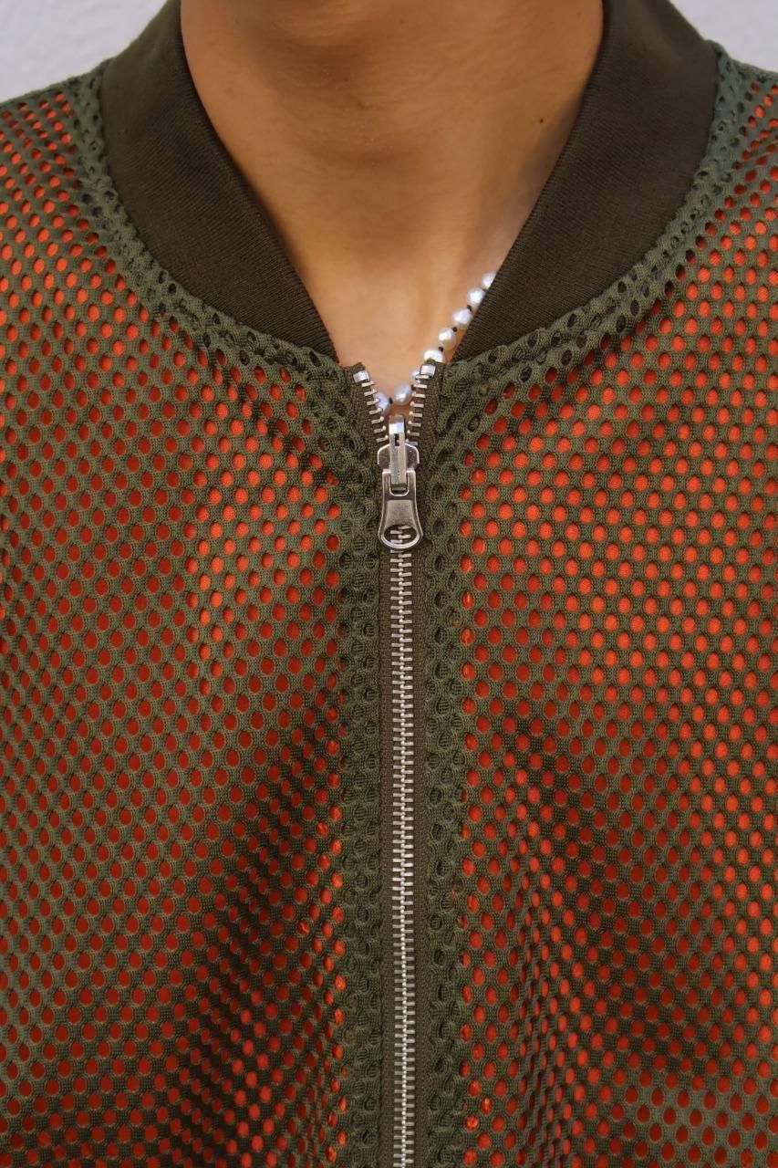 表は強度が高いポリエステル素材のメッシュ、裏はミリタリージャケットの裏地を完全再現したビビットなオレンジ。