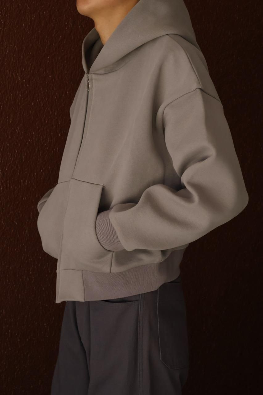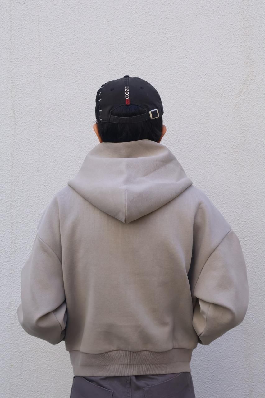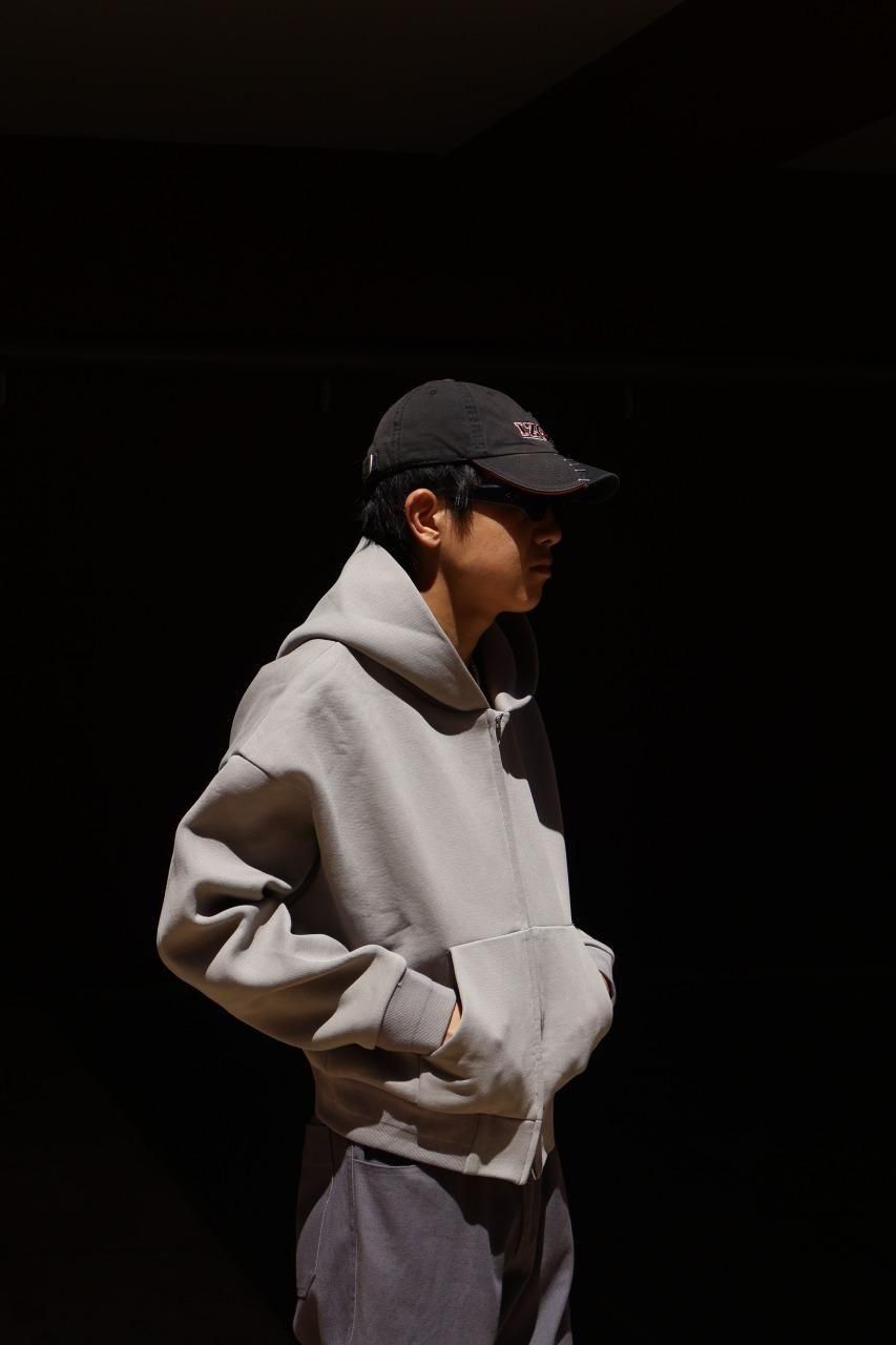 これだけ肉厚な生地のフーディは、もちろん通常の生産過程では作り上げることが不可能なので、テーラードのプレス技術を用いて、シルエットを構築しています。