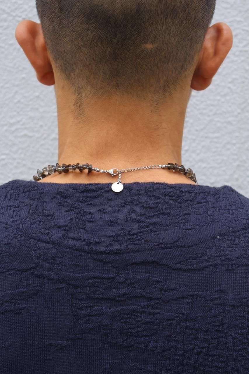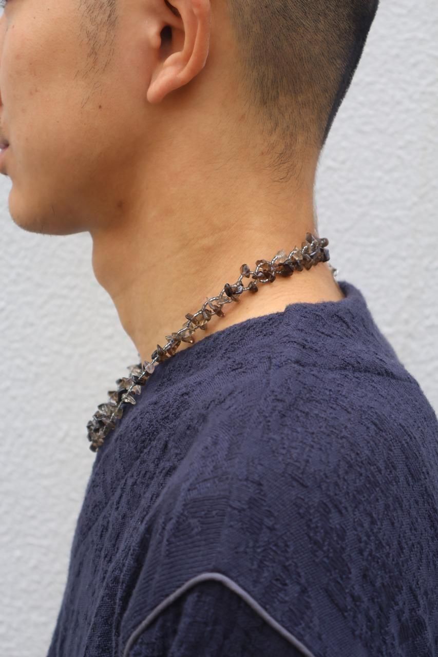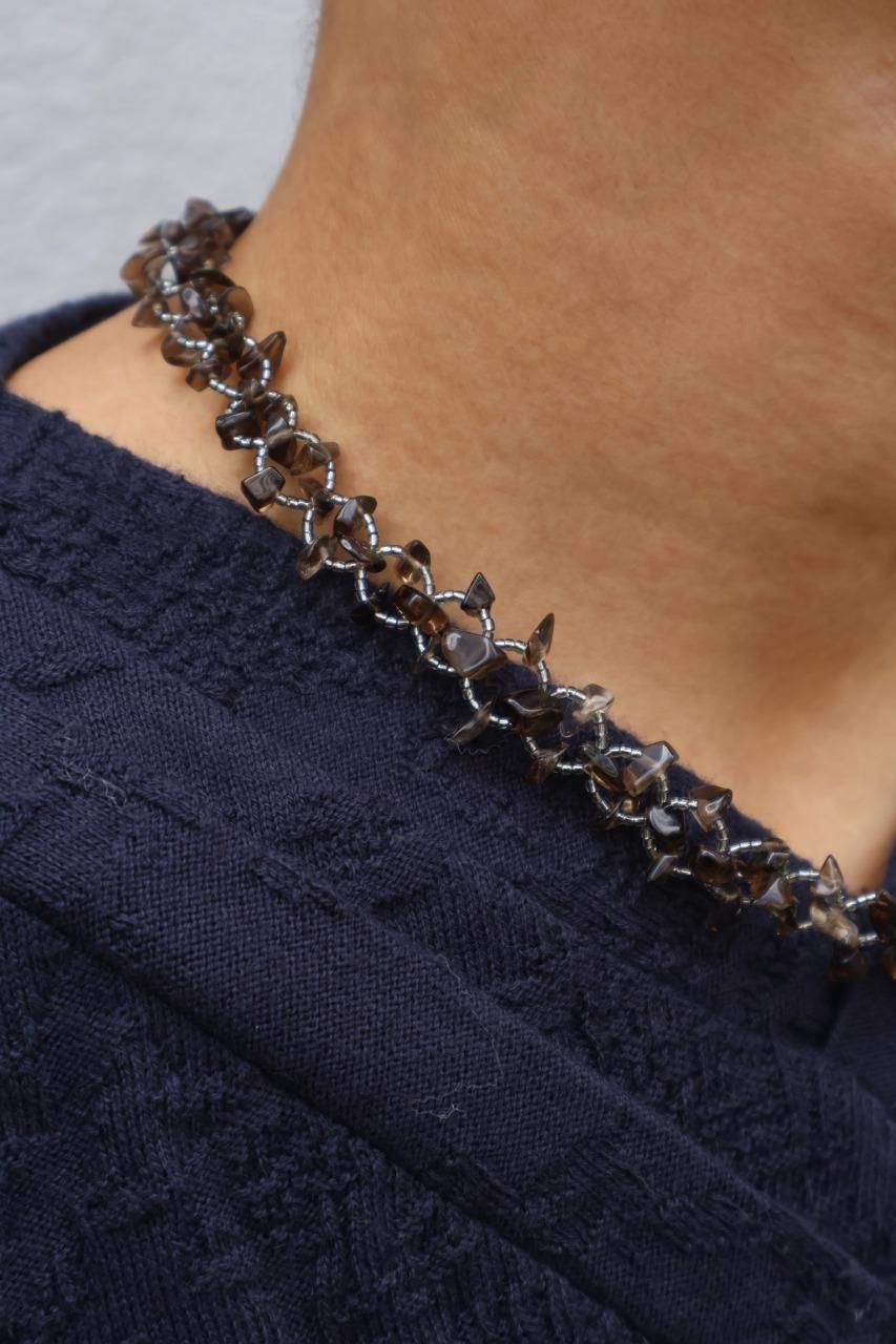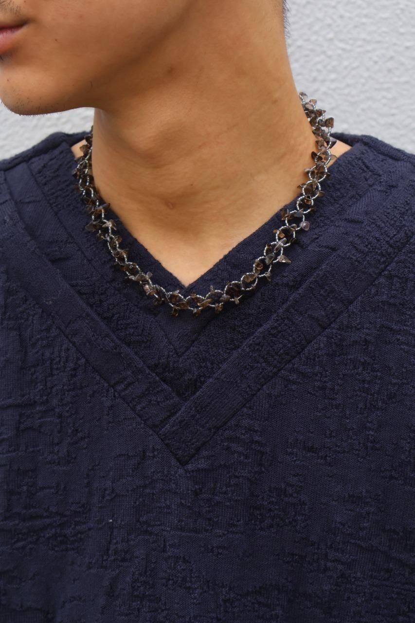 しなやかな品性と揺るぎないタフネスが同居するイメージから、天然石チップとガラスカットビーズを使用して製作しています。