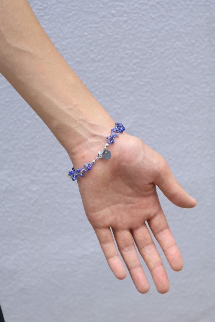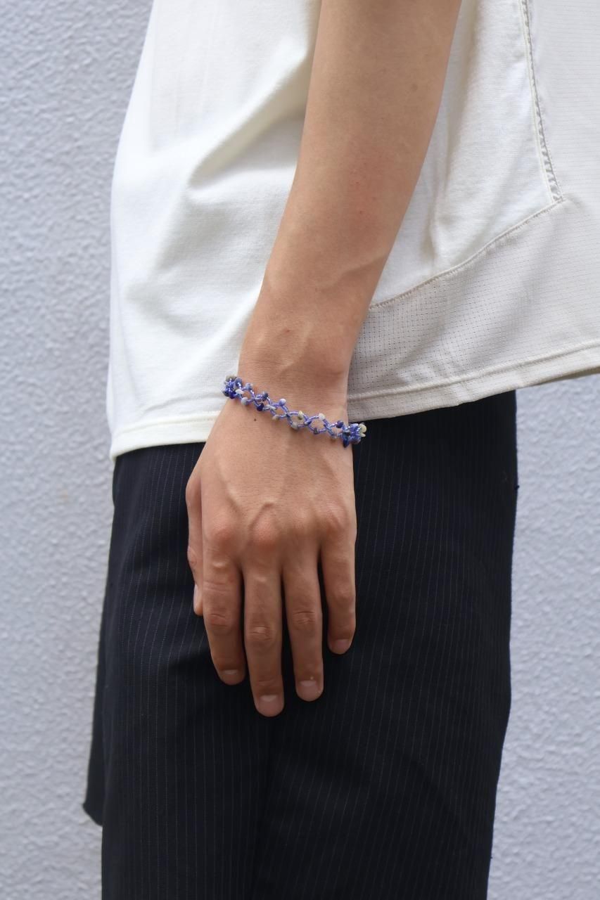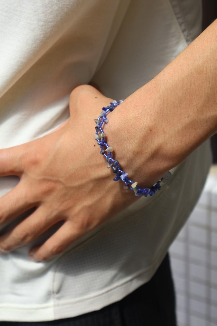 しなやかな品性と揺るぎないタフネスが同居するイメージから、天然石チップとガラスカットビーズを使用して製作しています。