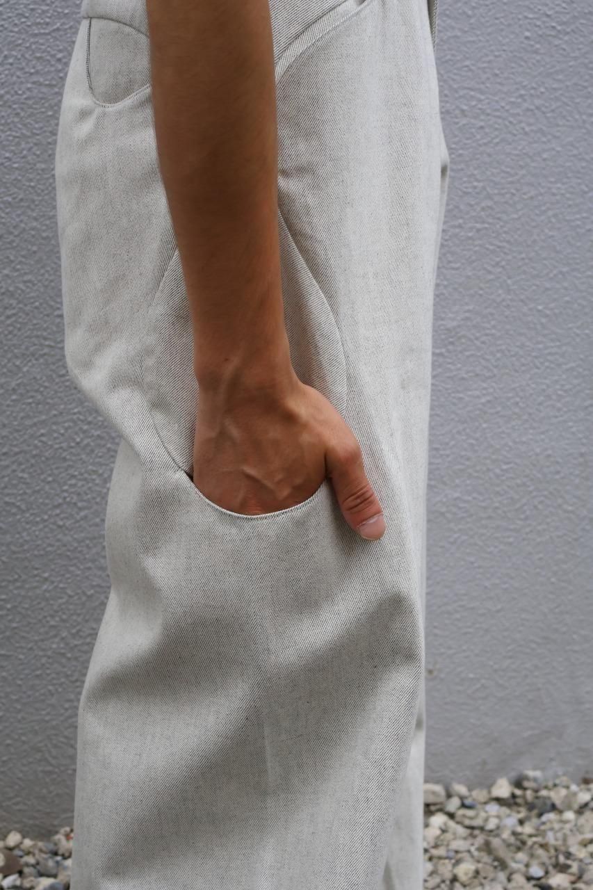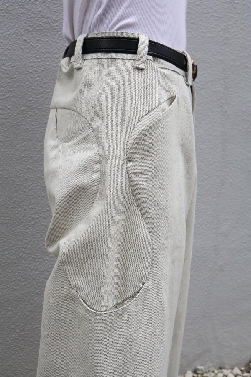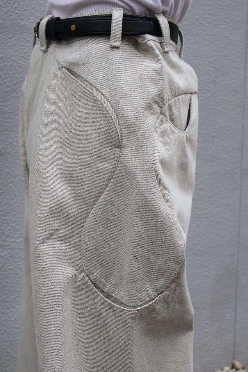 大きく3面で構成されており、一筆書きの様に曲線を描きながら後ろヨークから前へポケットの機能を加えながら繋がっているため、サイドシームが無くなり着用時のストレスを軽減する仕様となります。