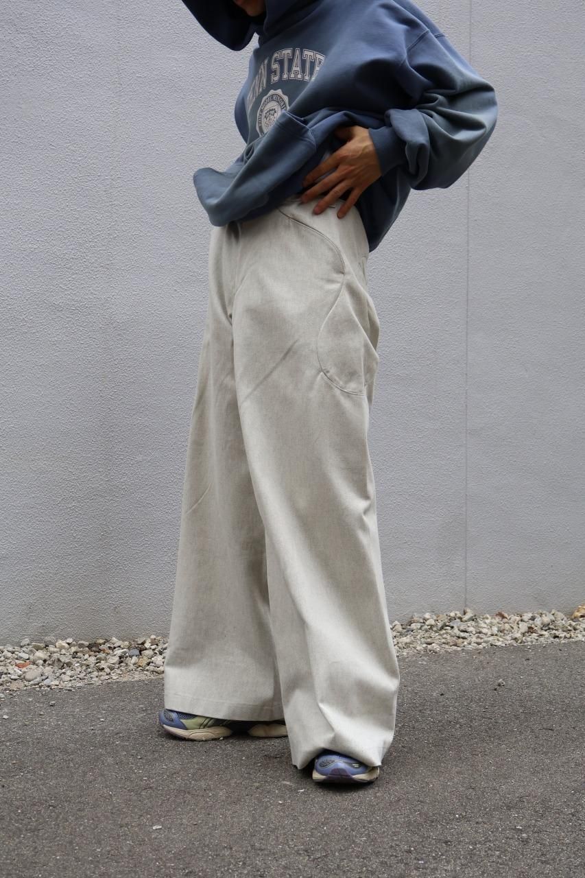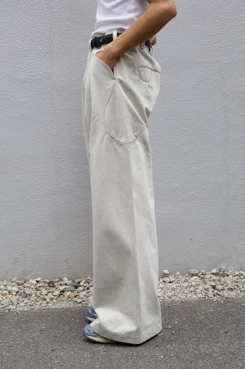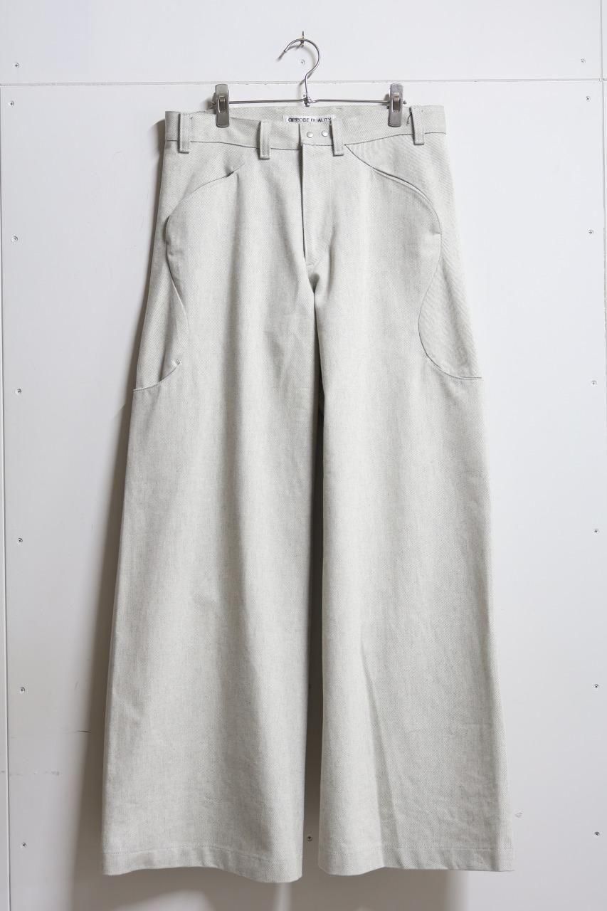 大きく3面で構成されており、一筆書きの様に曲線を描きながら後ろヨークから前へポケットの機能を加えながら繋がっているため、サイドシームが無くなり着用時のストレスを軽減する仕様となります。