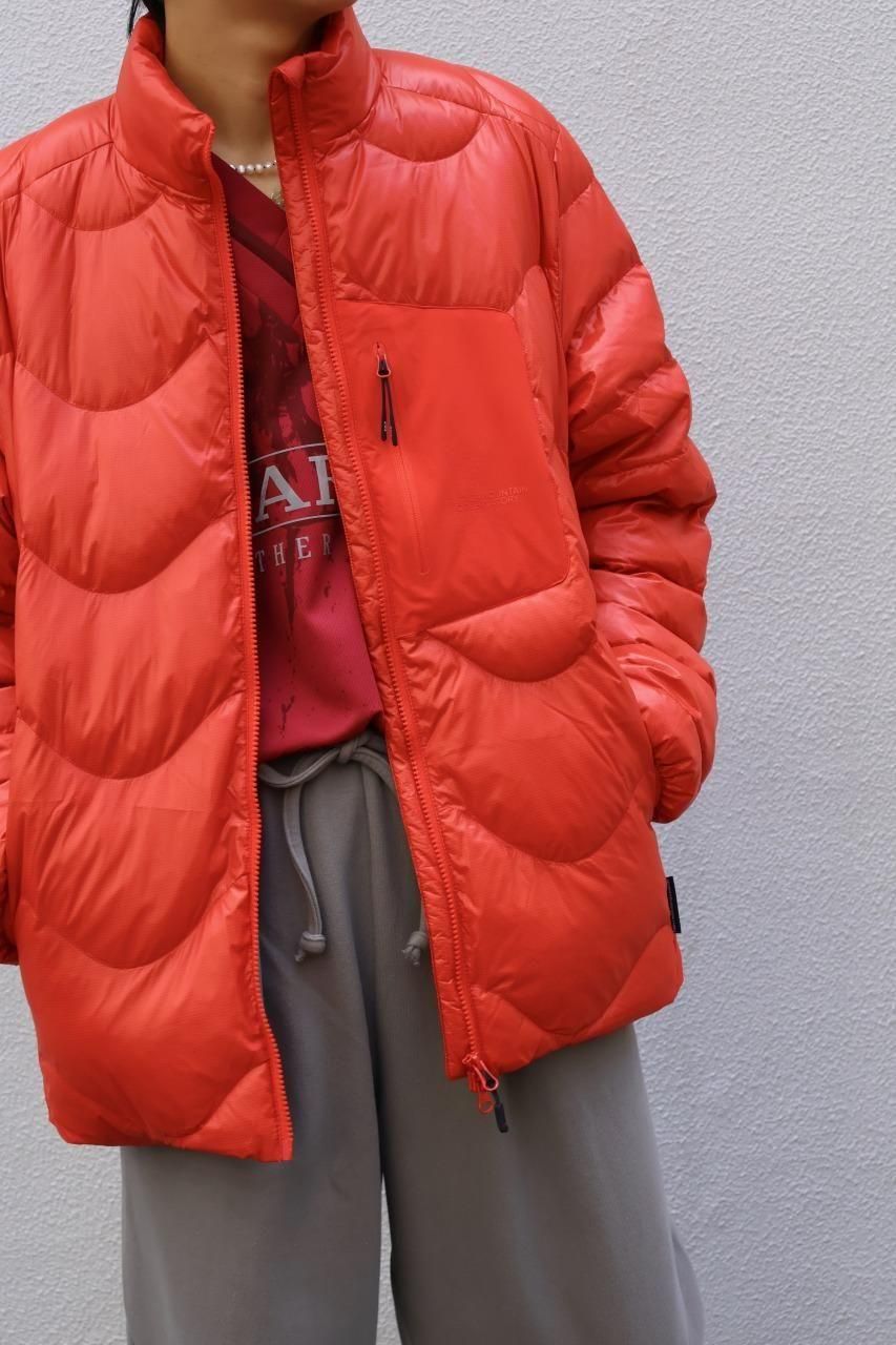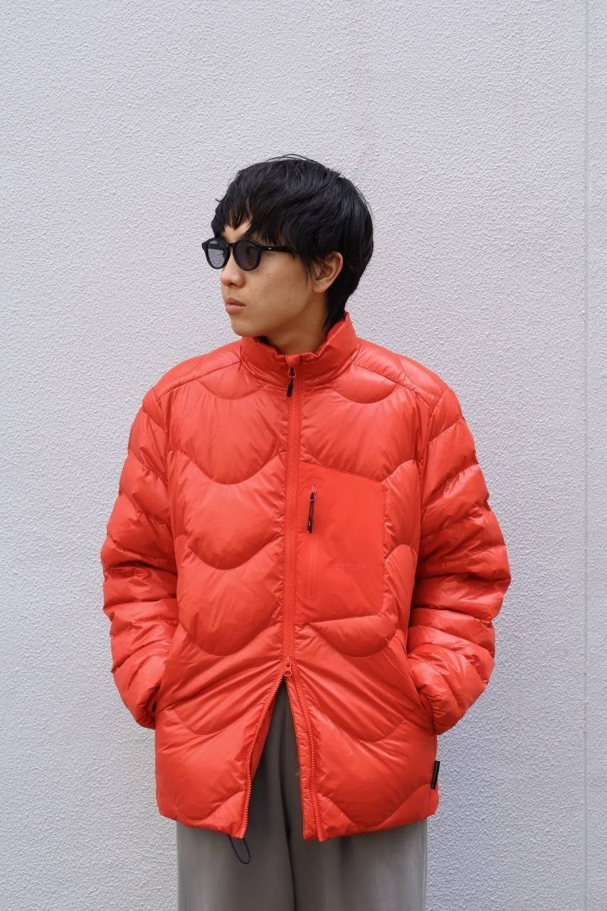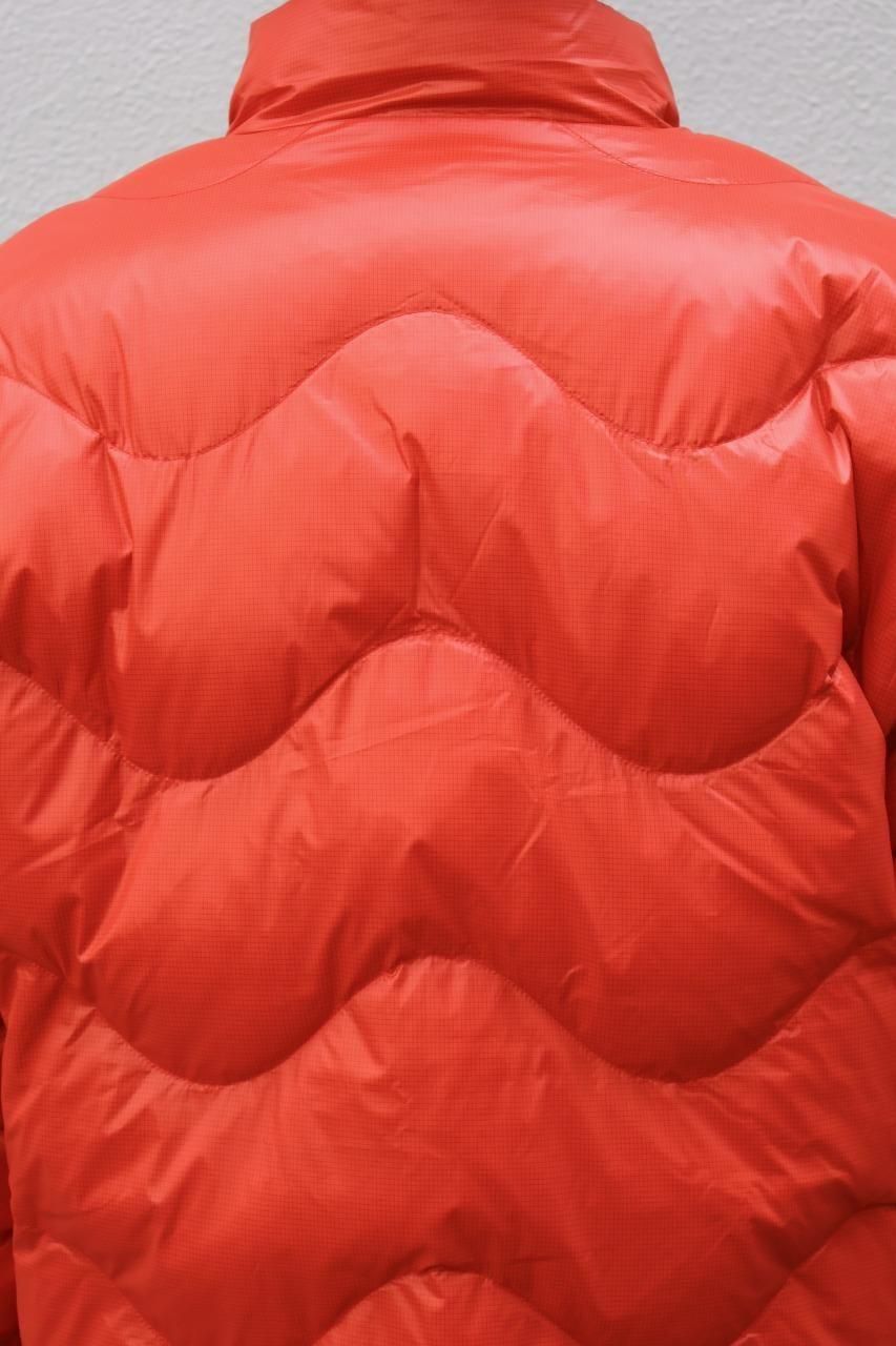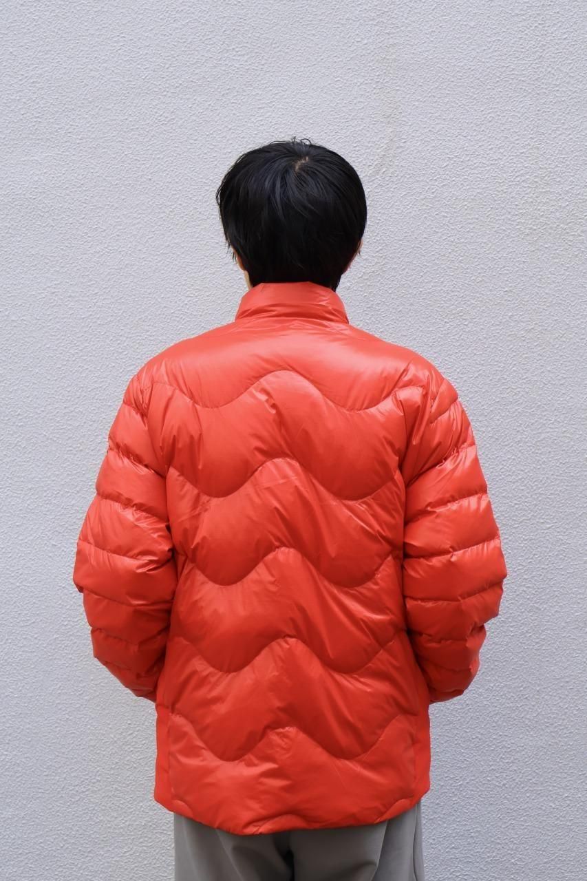 光沢感があるリップストップナイロンをシェルに採用した、ウェーブ型のステッチが目を惹くダウンジャケット。