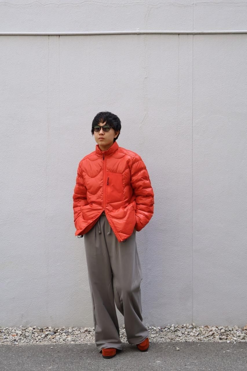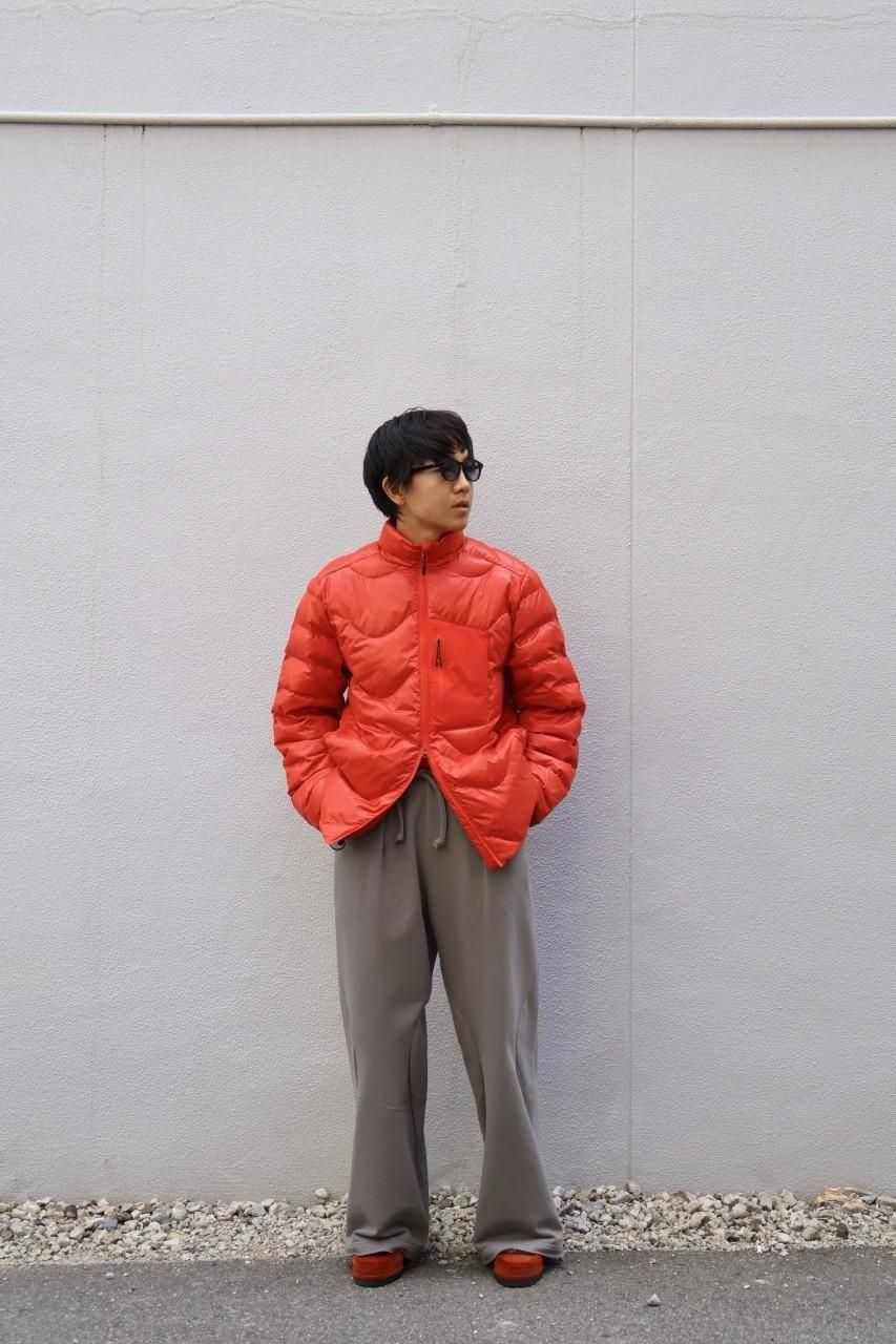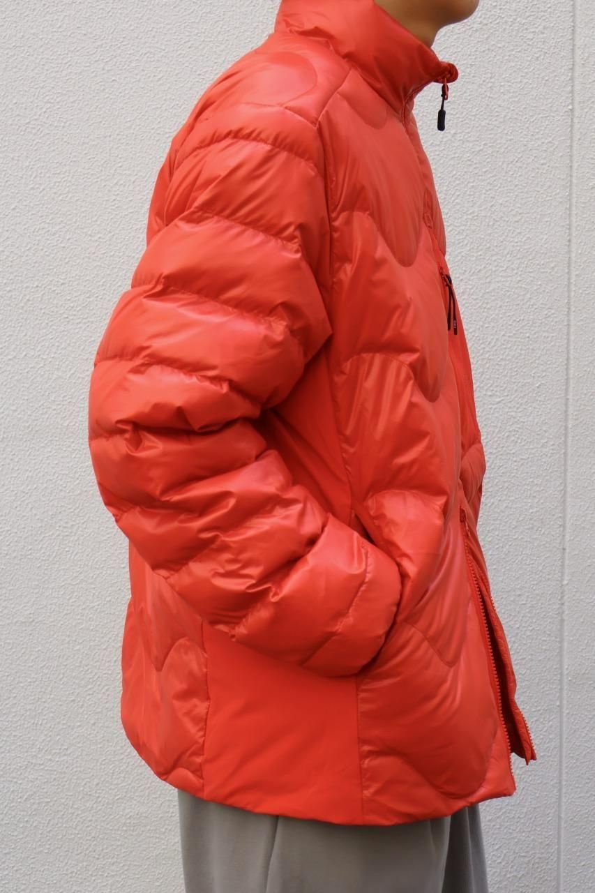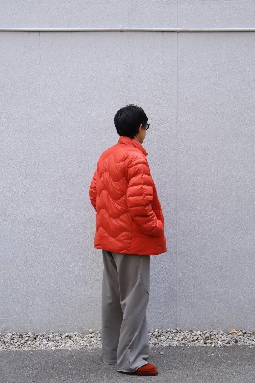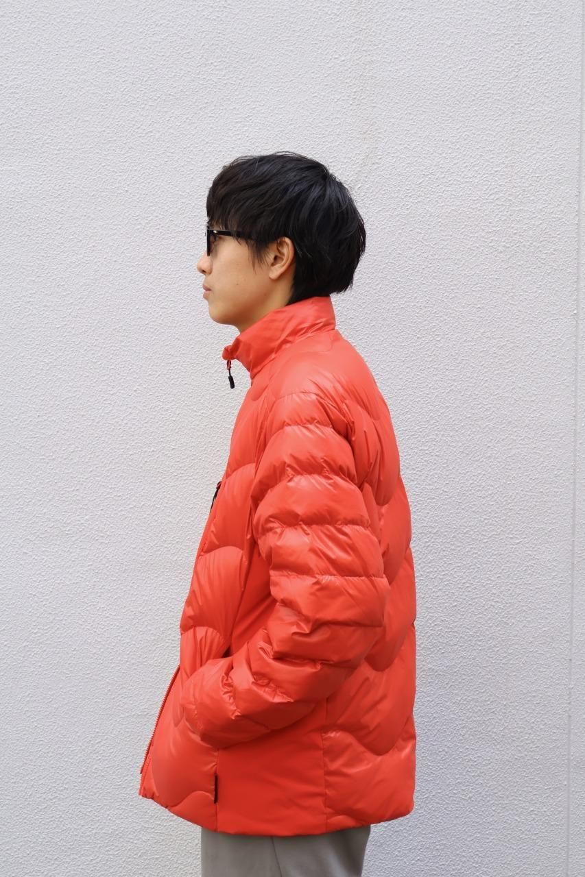 光沢感があるリップストップナイロンをシェルに採用した、ウェーブ型のステッチが目を惹くダウンジャケット。