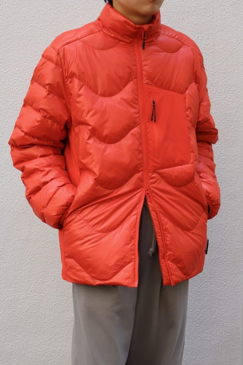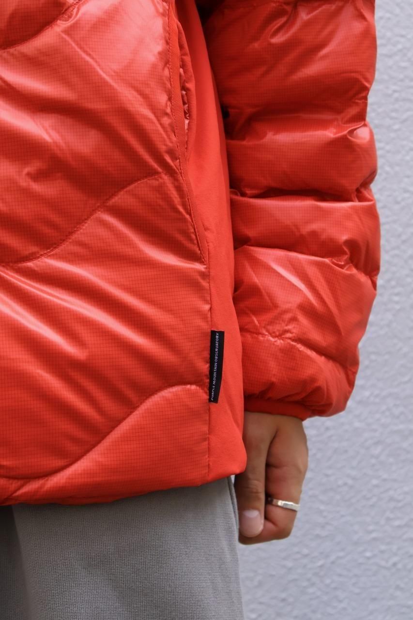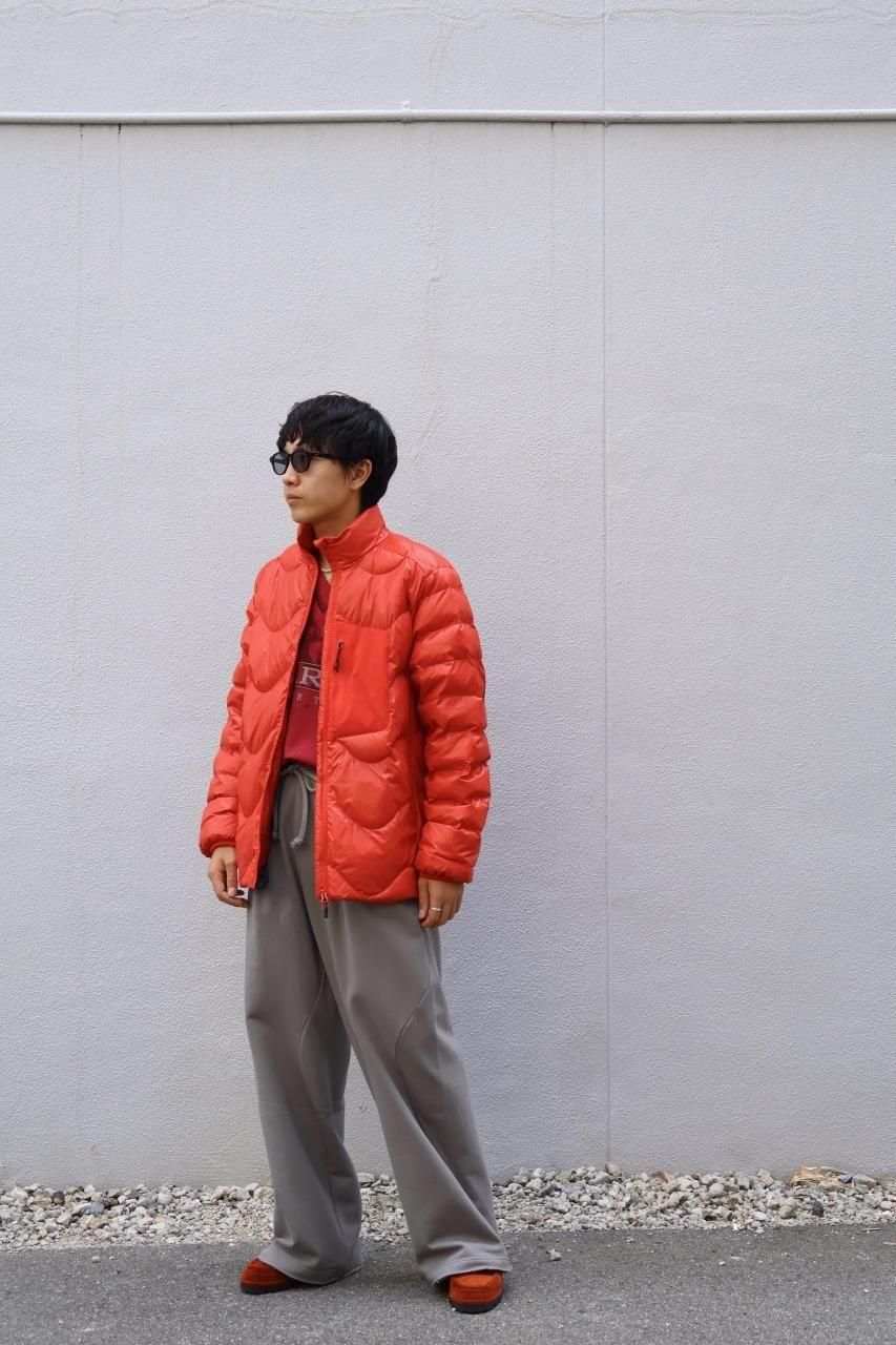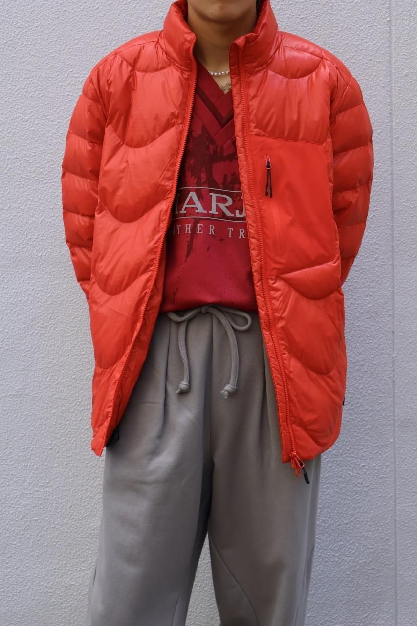 光沢感があるリップストップナイロンをシェルに採用した、ウェーブ型のステッチが目を惹くダウンジャケット。