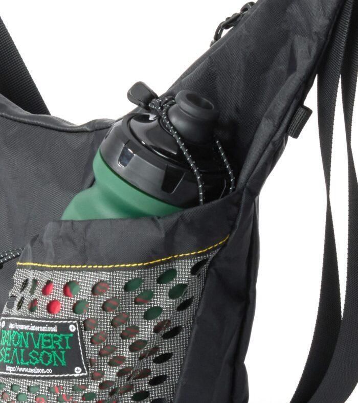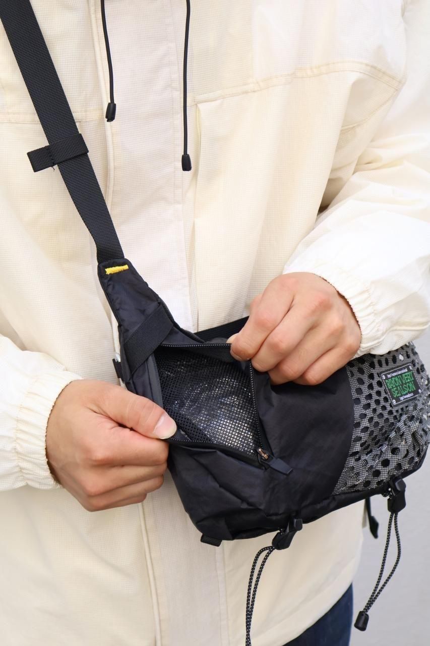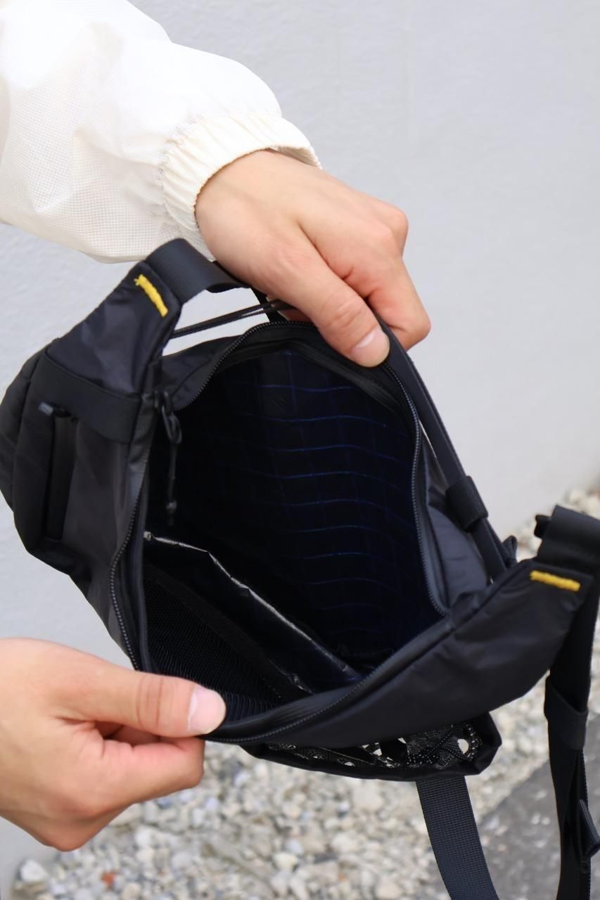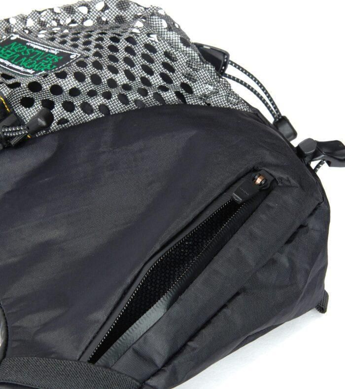 外側にドローストリング付きのレーザーカットメッシュポケットが1つ、メインポケットはフロント側面と上部からアクセス可能で、内部はメッシュで仕切られているため、実際のサイズ感以上に収納力に長けています。