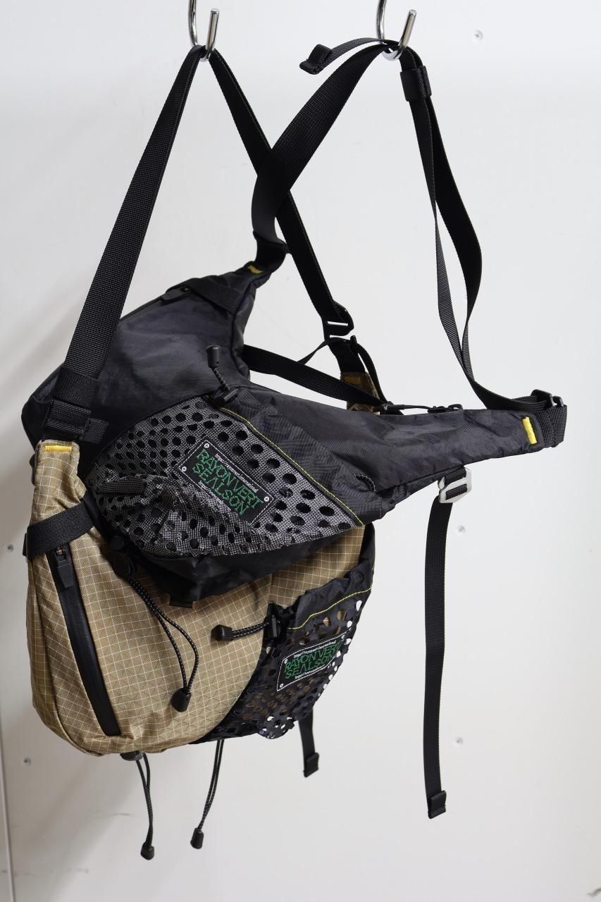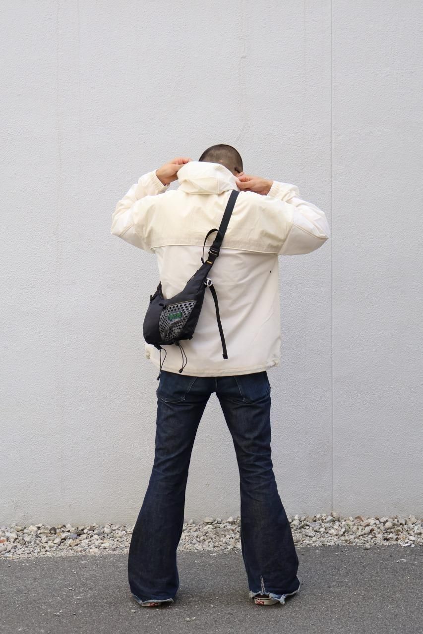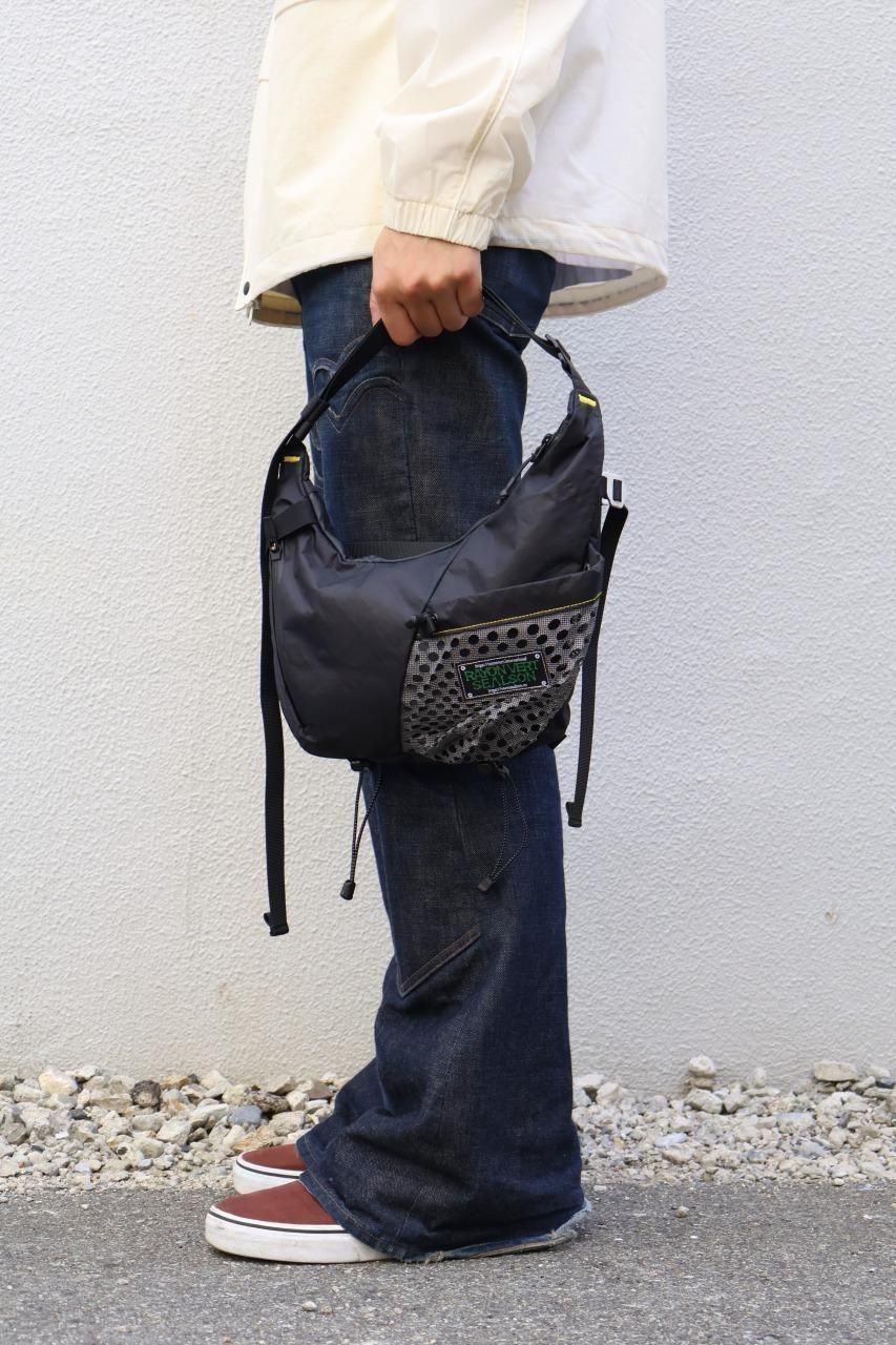 外側にドローストリング付きのレーザーカットメッシュポケットが1つ、メインポケットはフロント側面と上部からアクセス可能で、内部はメッシュで仕切られているため、実際のサイズ感以上に収納力に長けています。