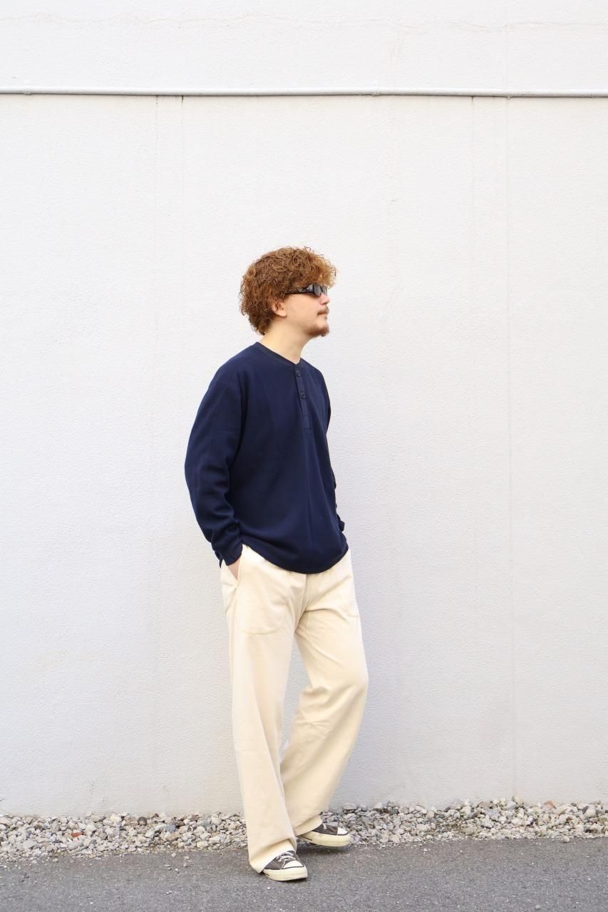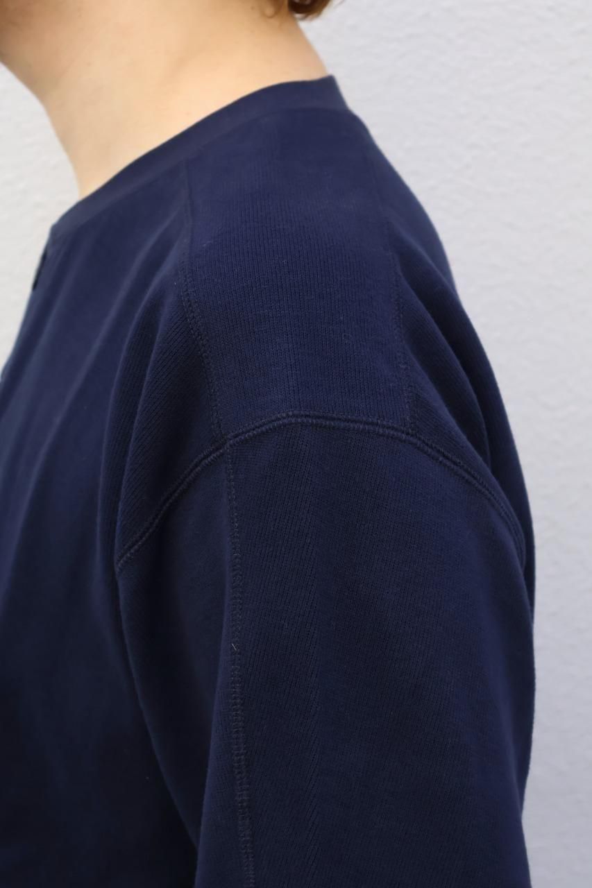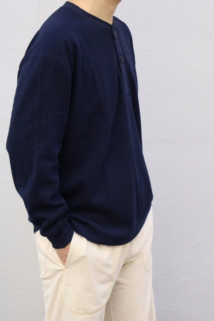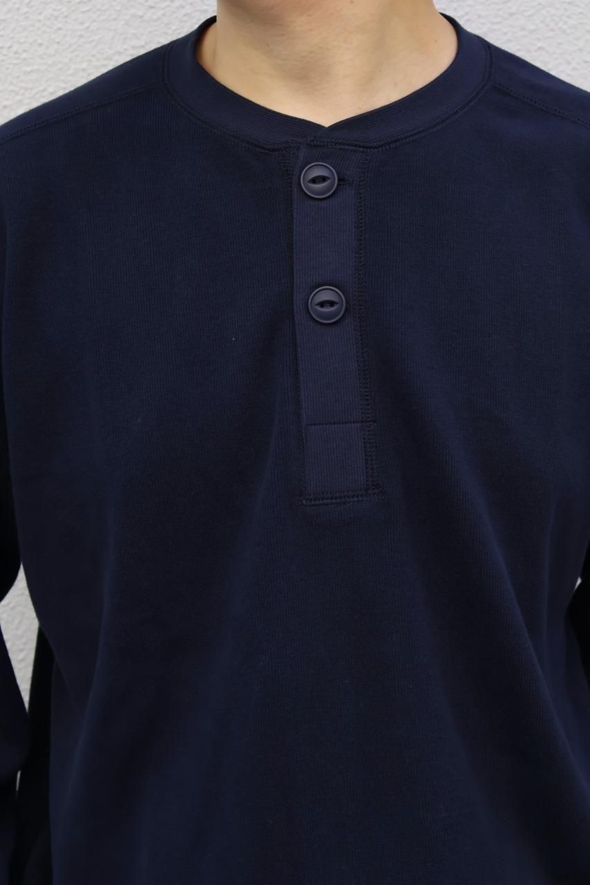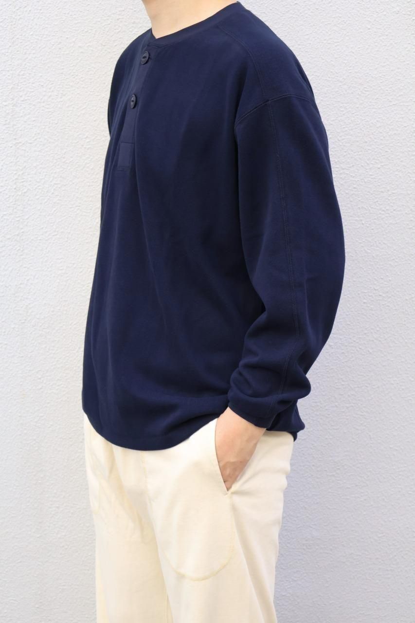 1枚での着用でもインナーとしても使える素材感の、ニットソー素材のヘンリーネックスタイル。