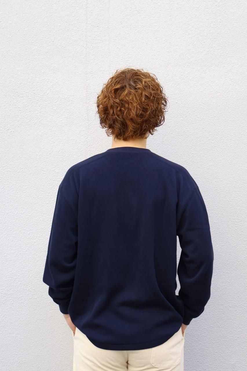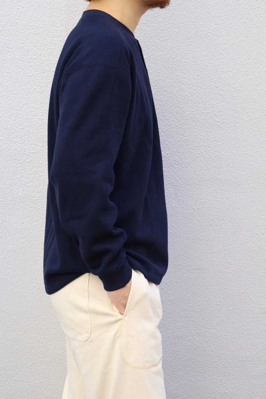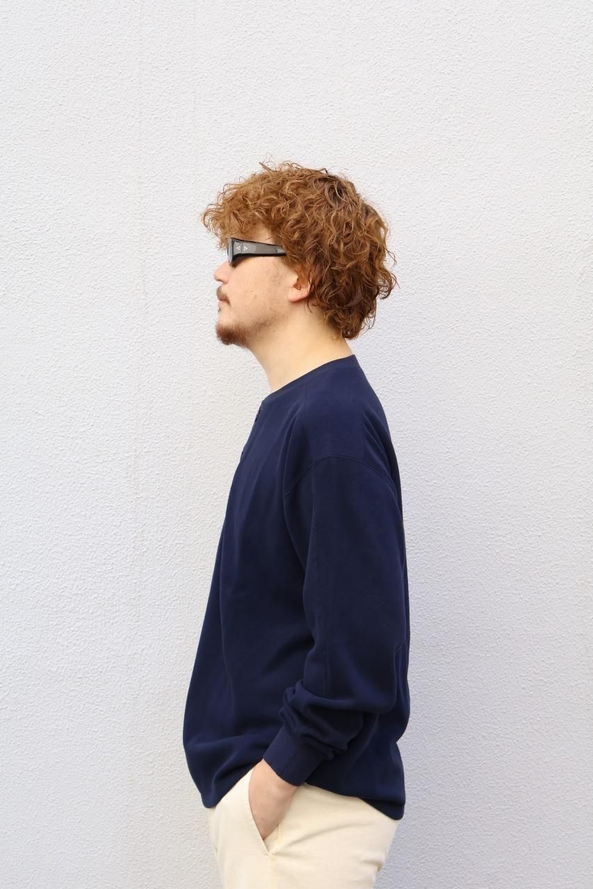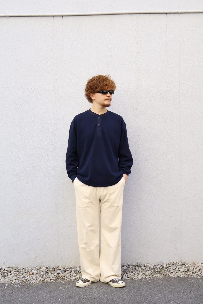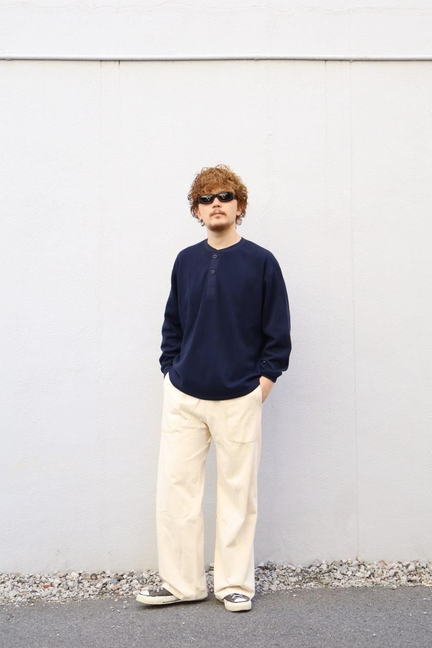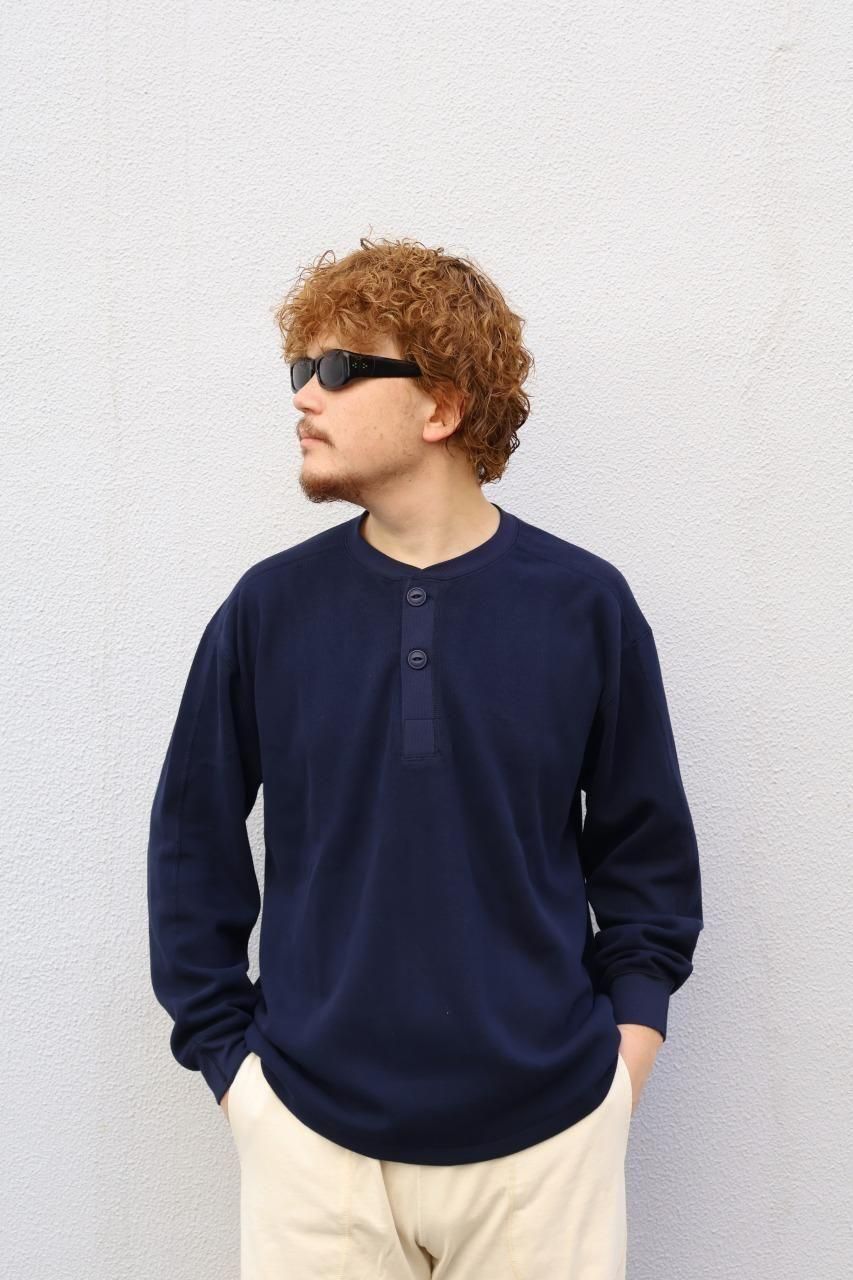 1枚での着用でもインナーとしても使える素材感の、ニットソー素材のヘンリーネックスタイル。