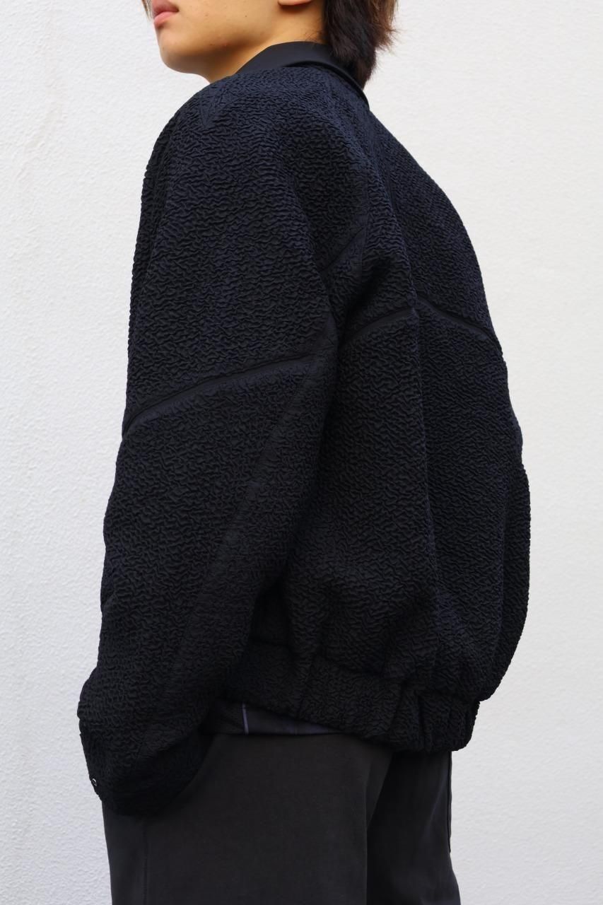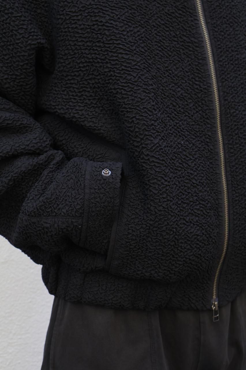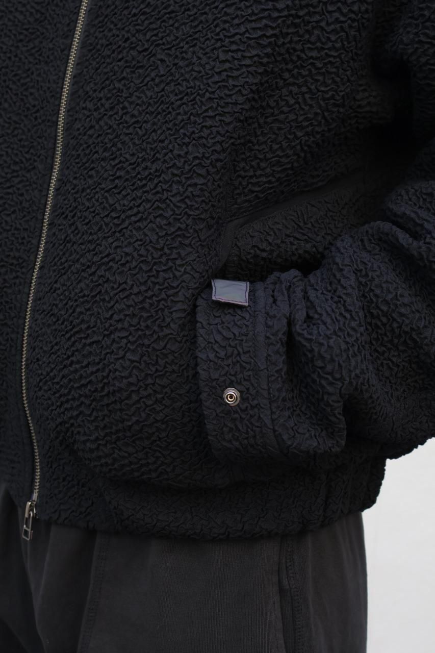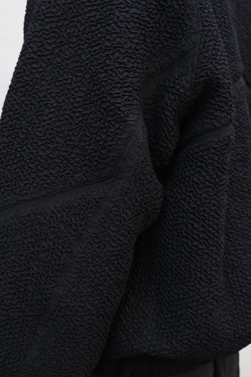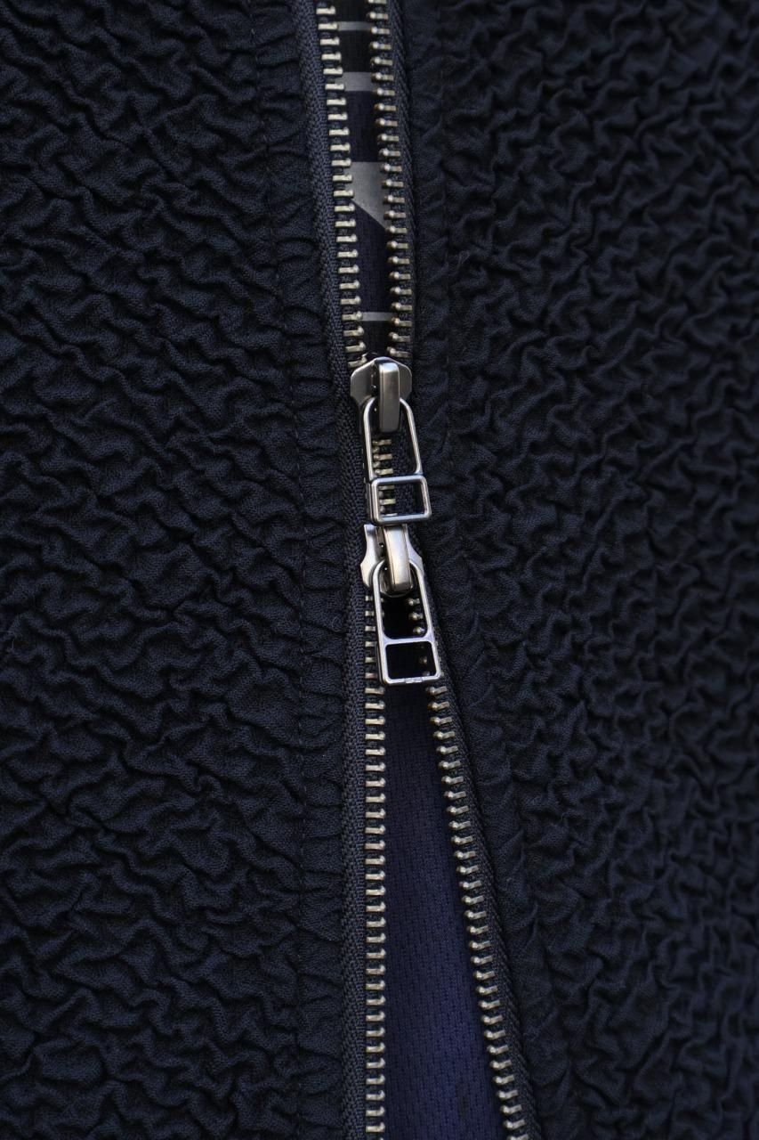 メリノウールと吸水速乾性の高いエステル糸の収縮差を利用することで、脳回(皺)のような表面感を実現。