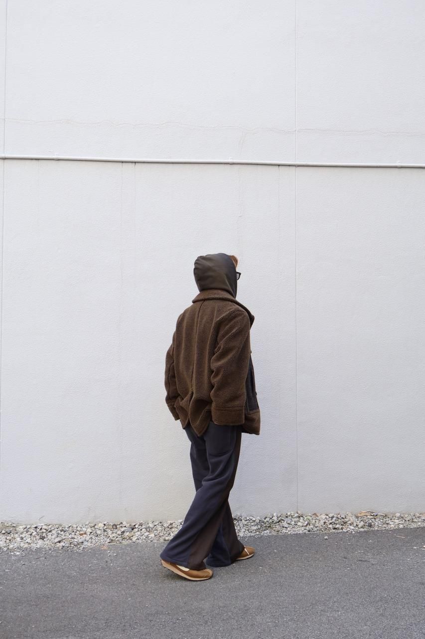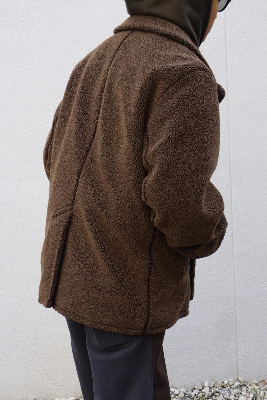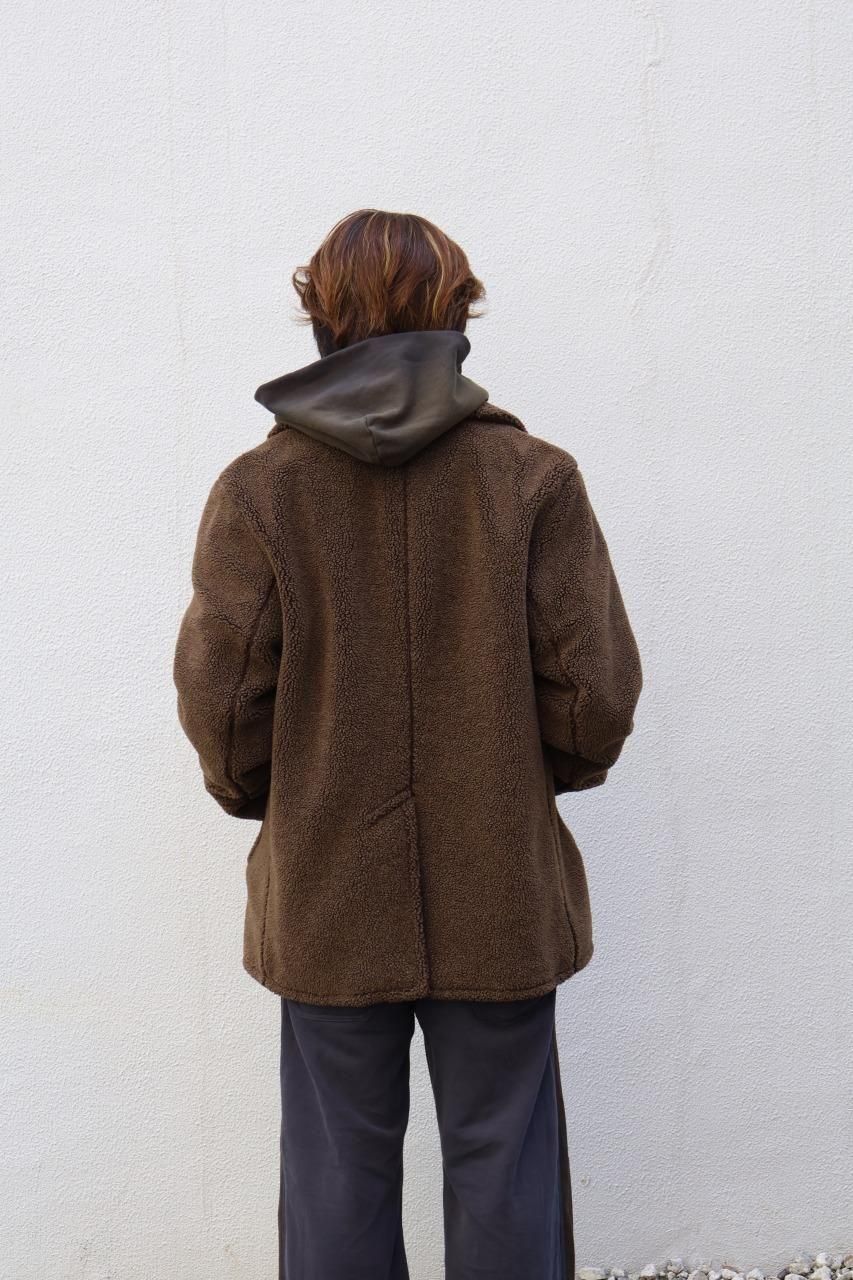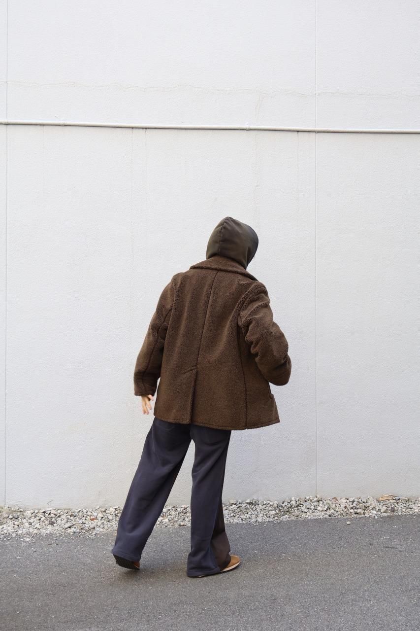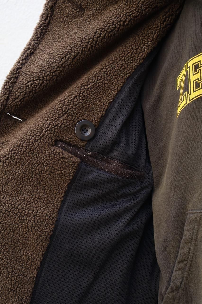 ジャージ素材での縫製や形成が困難とされるテーラリング技術を採用し、襟、袖付き、裏地の仕様などの細部に至る仕様まで、可能な限り丁寧に仕立て、フォルム形成を実現した、ボアPコート。