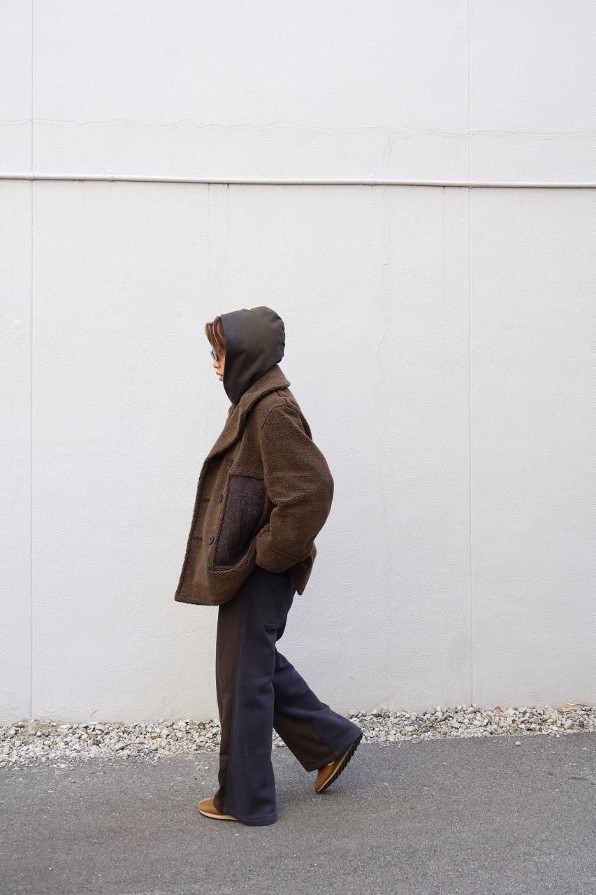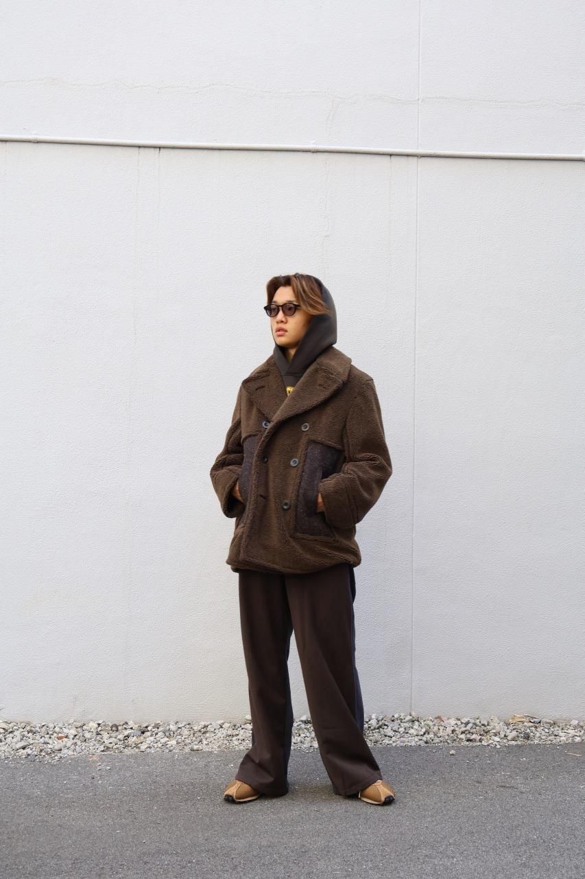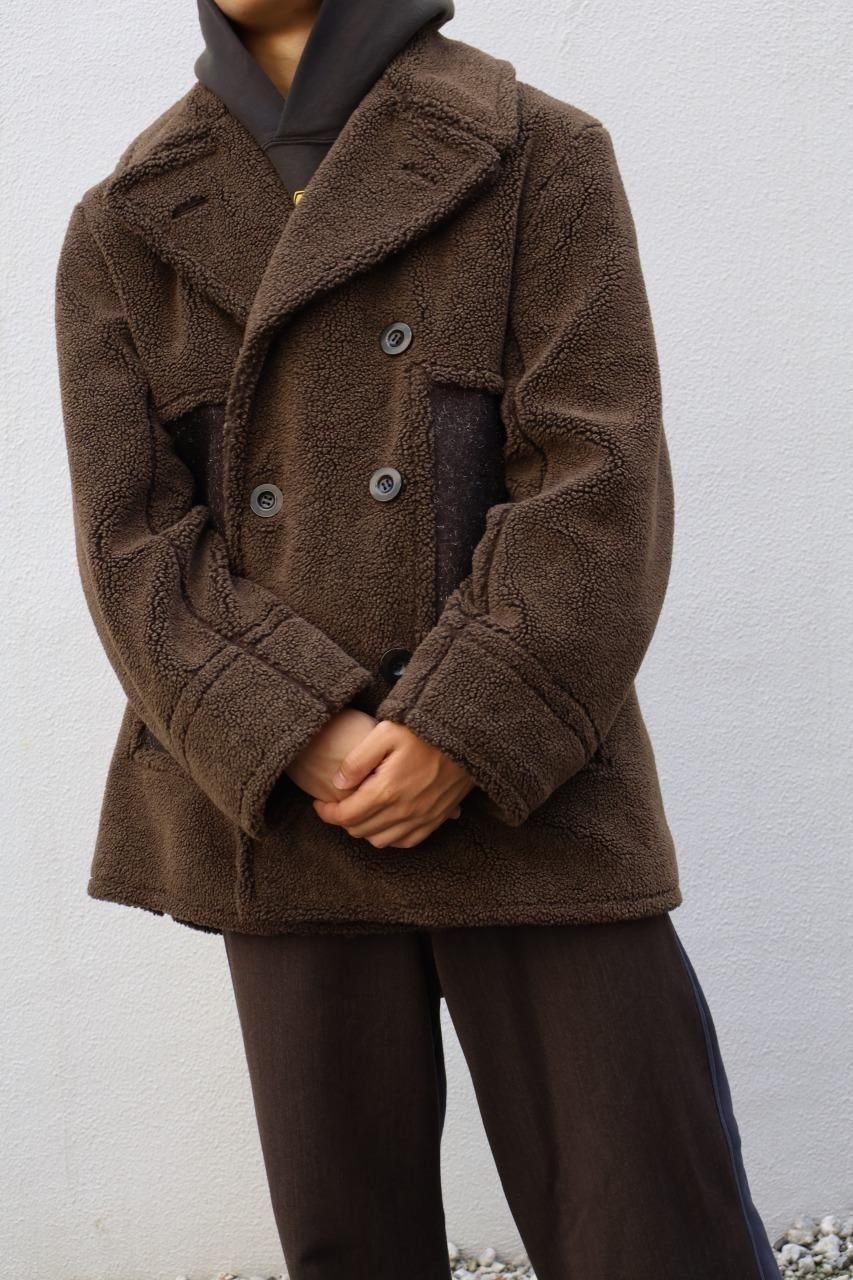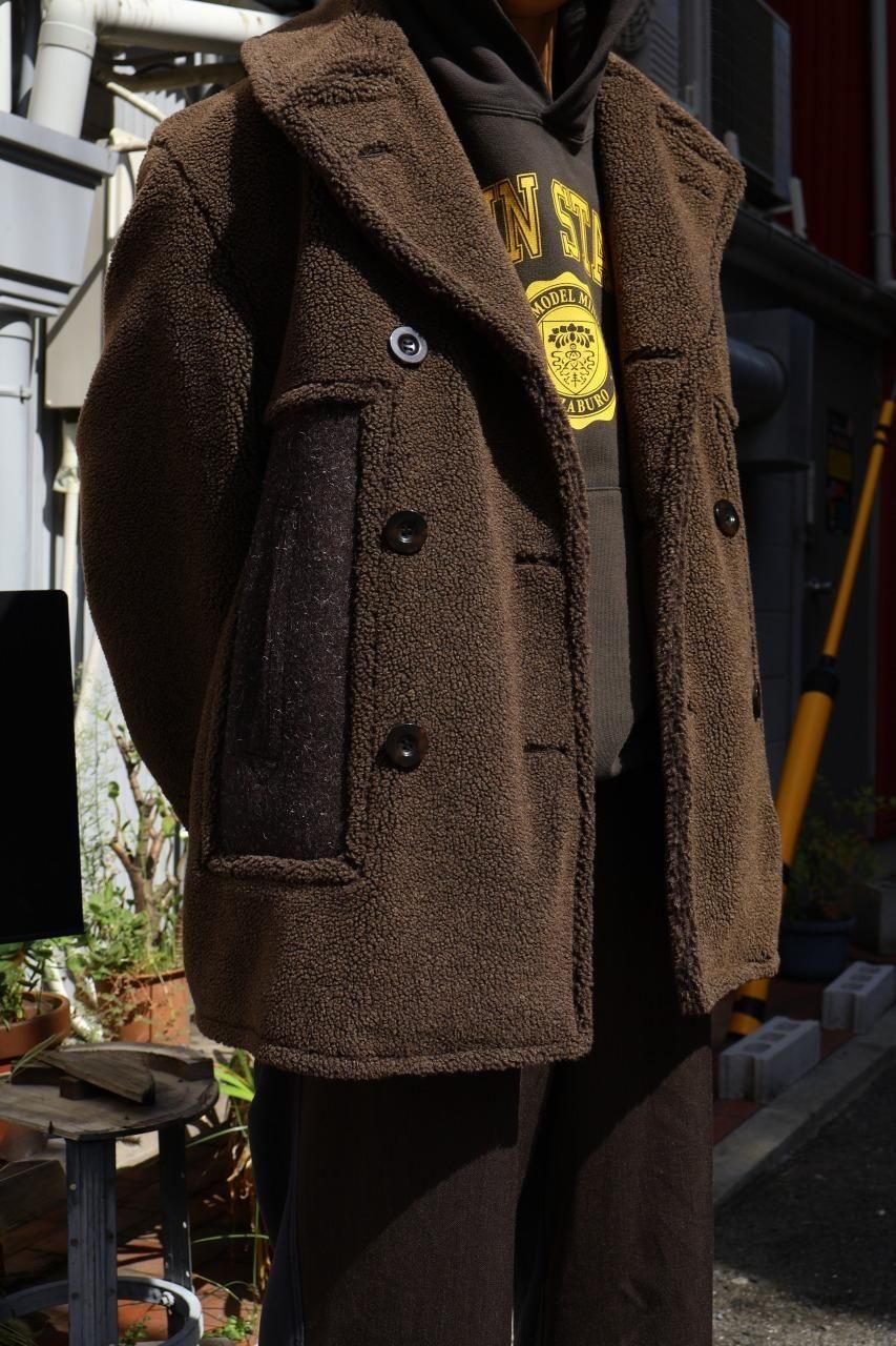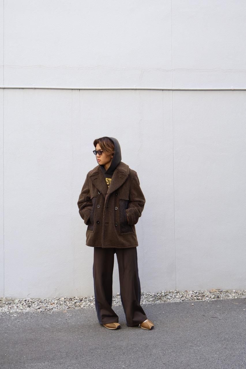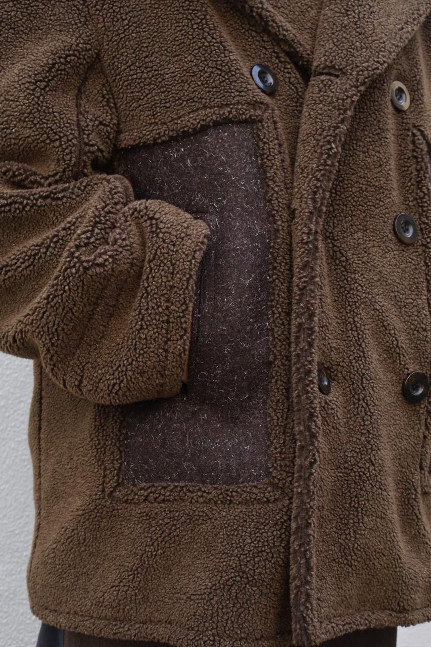 ジャージ素材での縫製や形成が困難とされるテーラリング技術を採用し、襟、袖付き、裏地の仕様などの細部に至る仕様まで、可能な限り丁寧に仕立て、フォルム形成を実現した、ボアPコート。