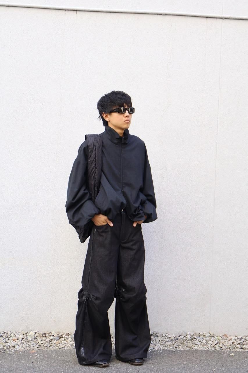 膝部分にダーツを組み込み立体性を持たせ、フレアのようなシルエットへと消化しております。