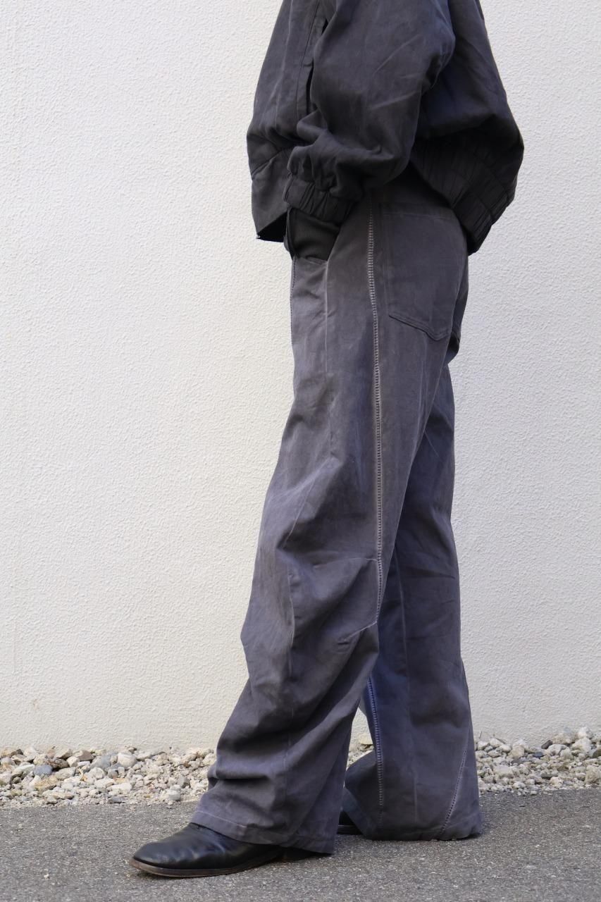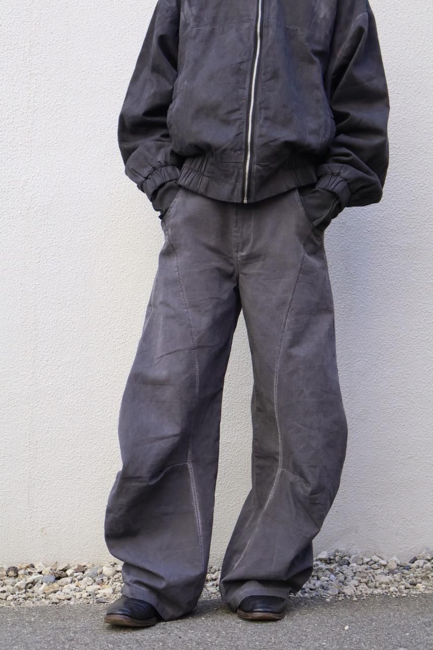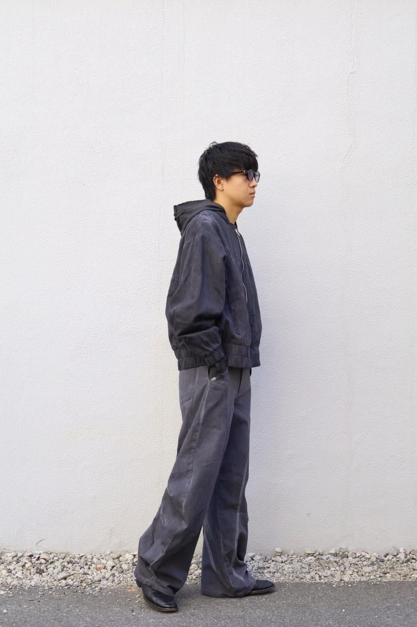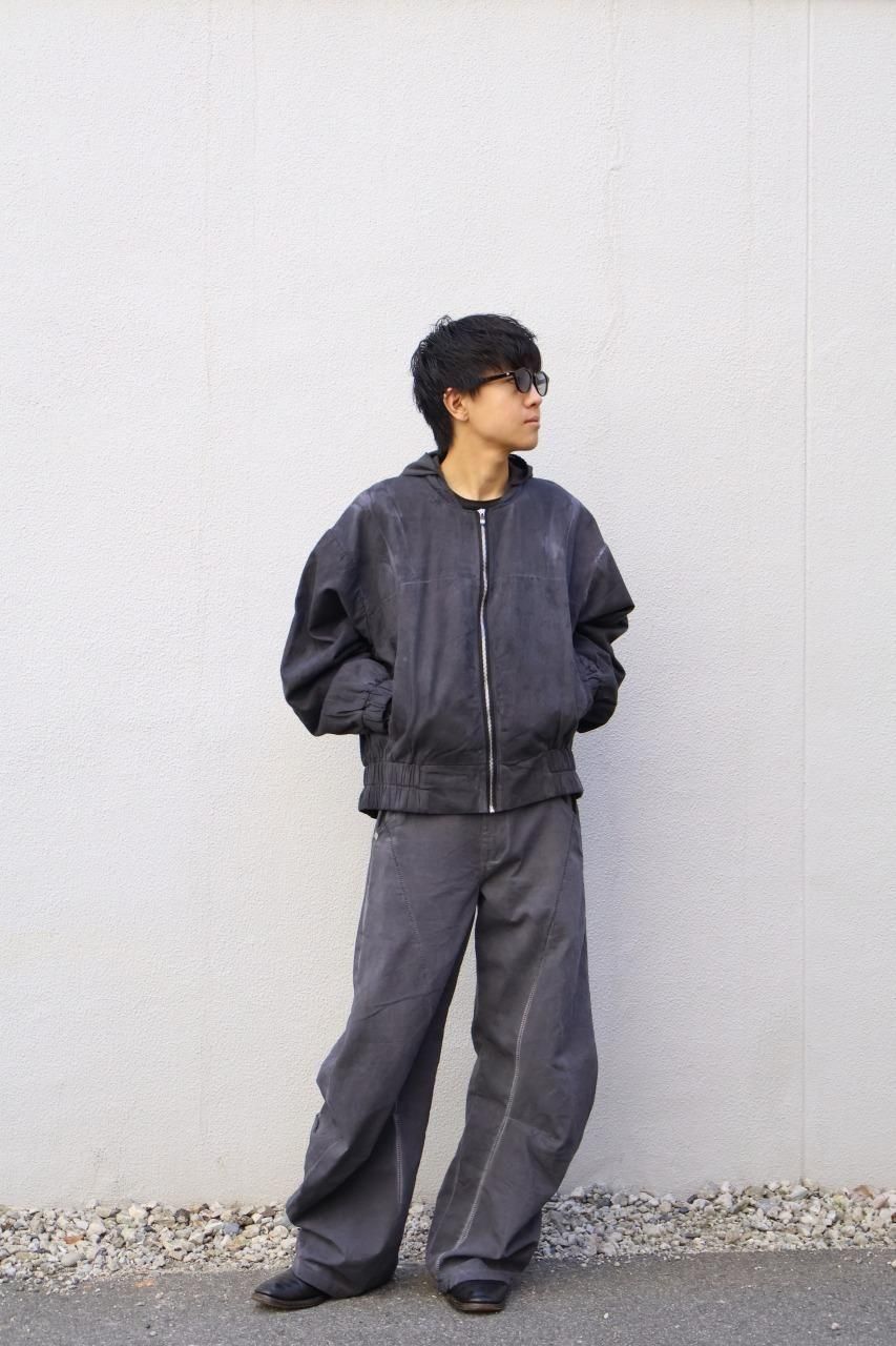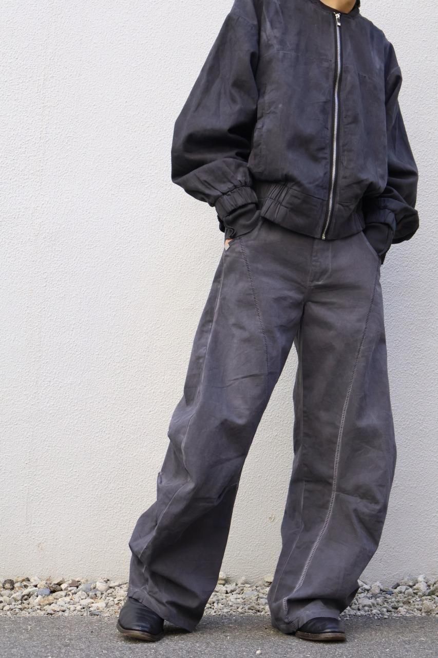 ライトながら頼り甲斐のあるコットンツイルに、後染めとタンブラー加工を施して再現したフェード感で、今季のテーマである「廃れ」を表現しており、シームが剥き出しになっているデザインも「廃れ」を表しております。