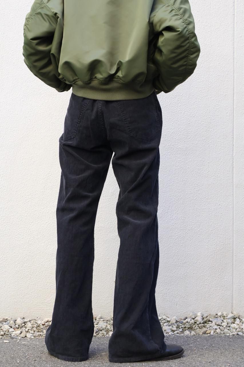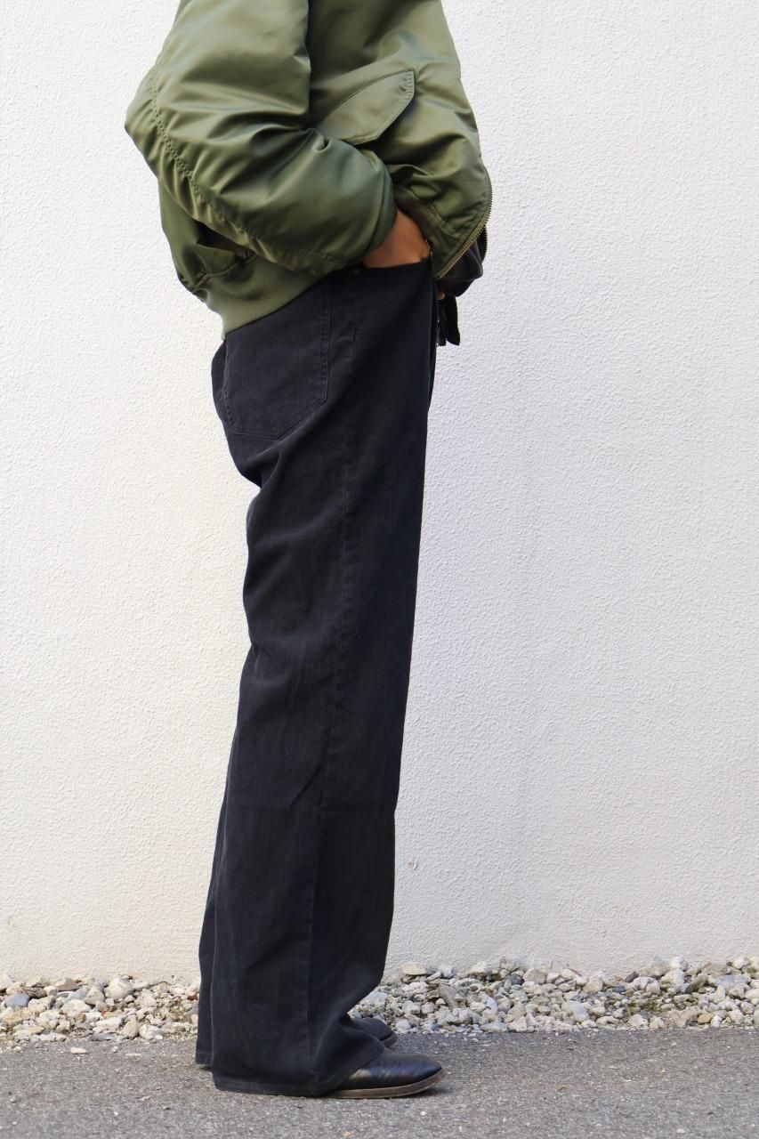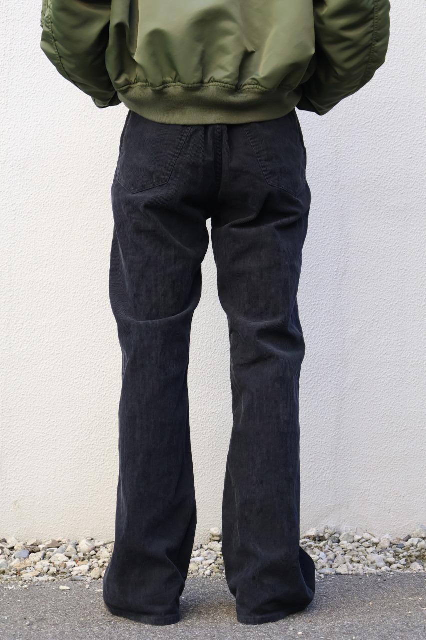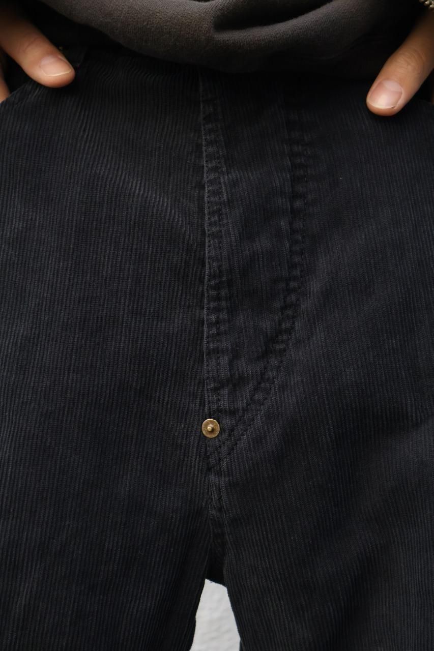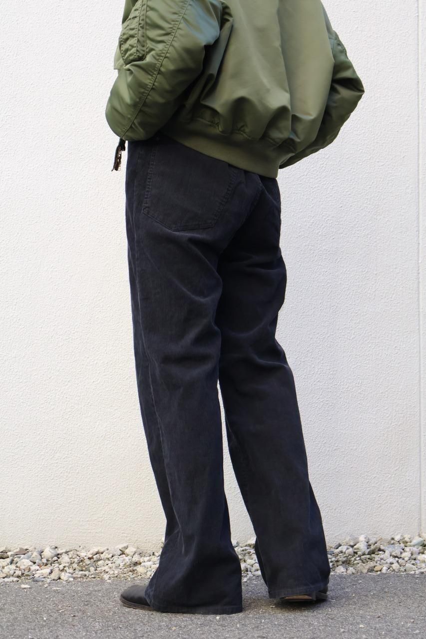 スラブ糸を使用したコーデュロイに硫化染めを施し、独特の色合いとムラ感を表現。さらに製品加工でストーンバイオを施すことで、程よくこなれた風合いに仕上げている。