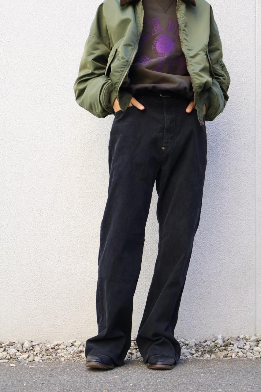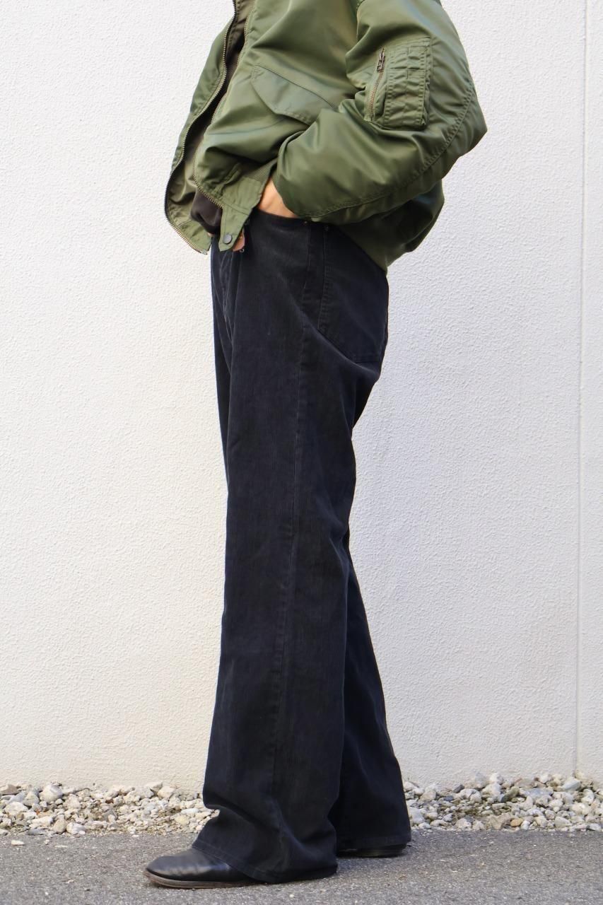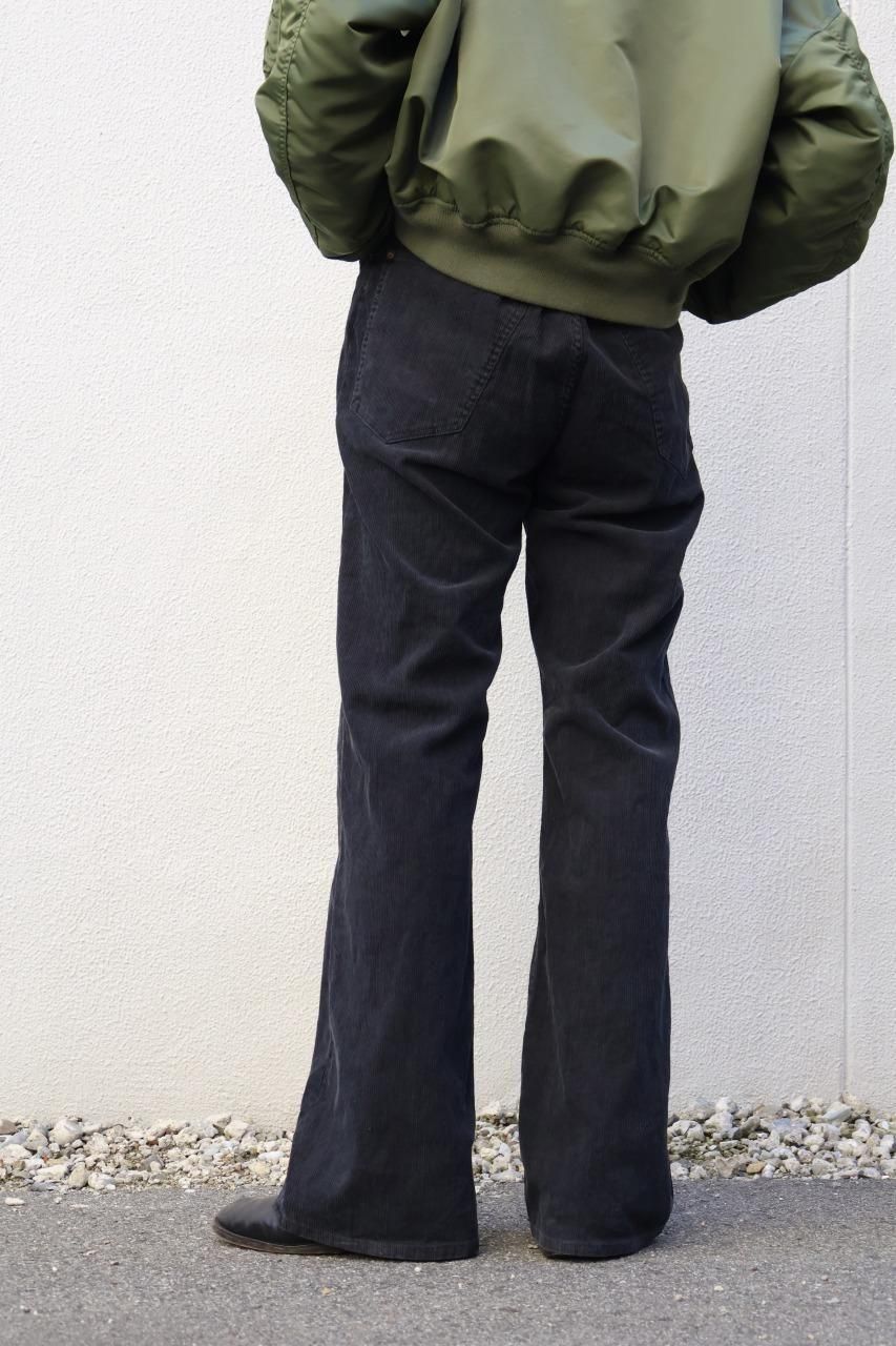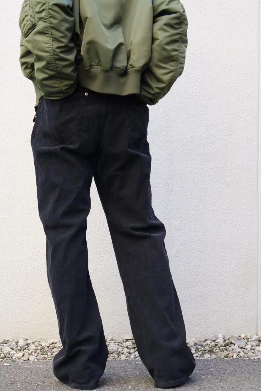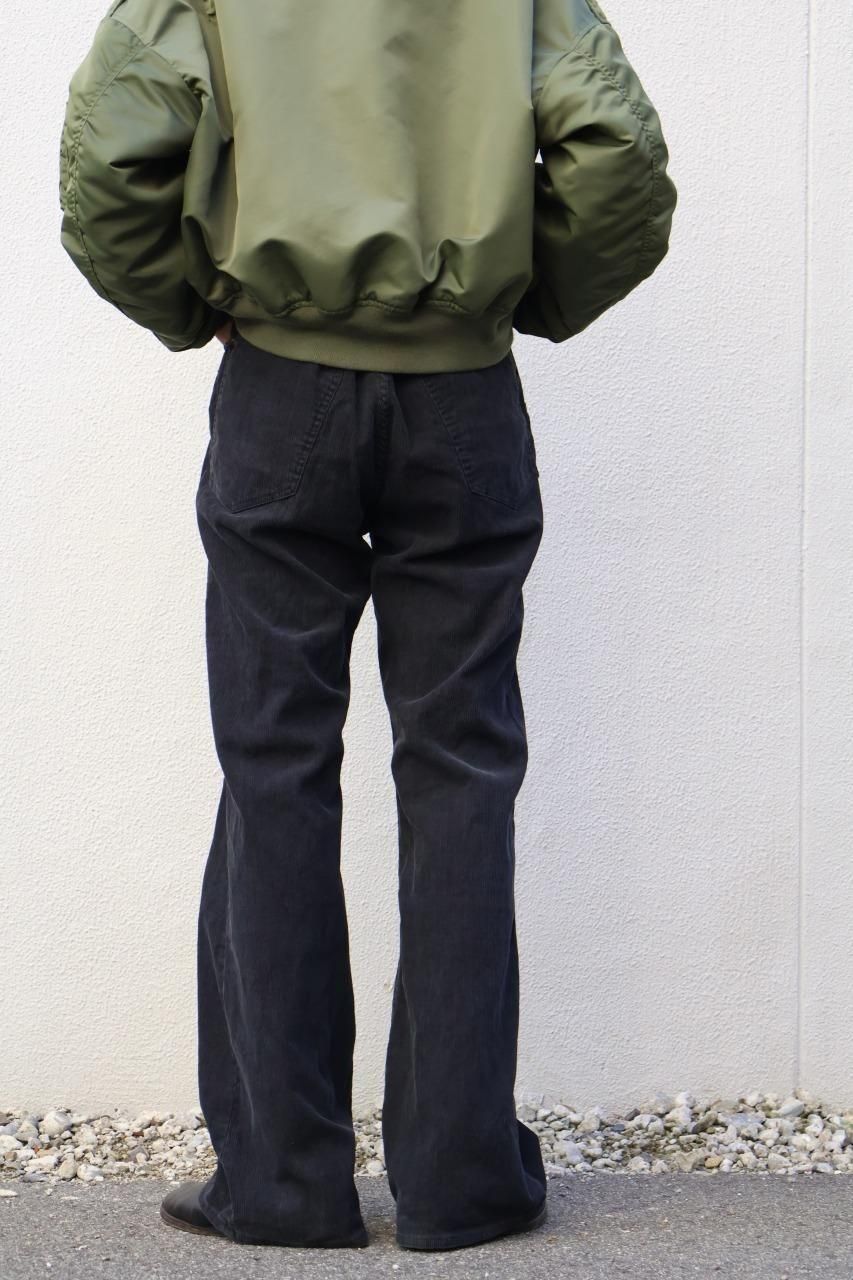 スラブ糸を使用したコーデュロイに硫化染めを施し、独特の色合いとムラ感を表現。さらに製品加工でストーンバイオを施すことで、程よくこなれた風合いに仕上げている。