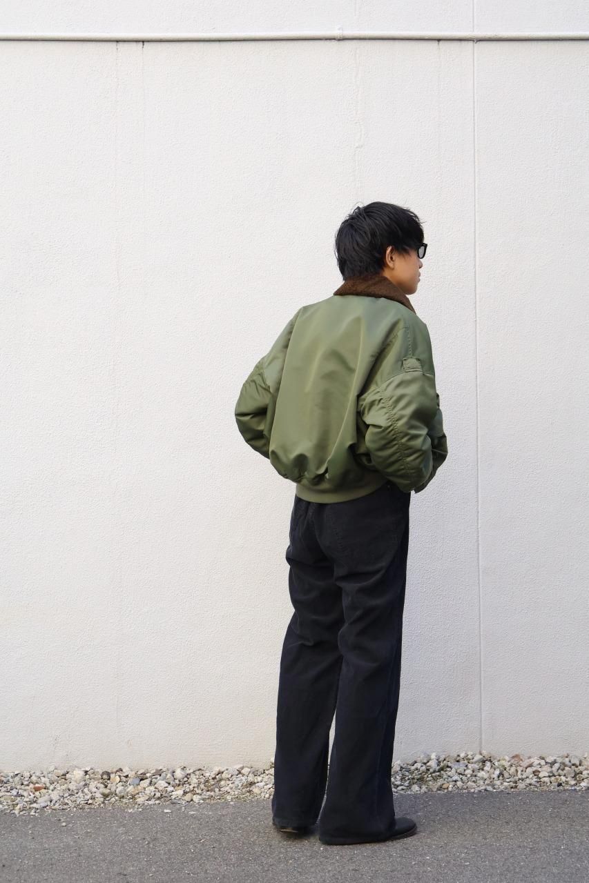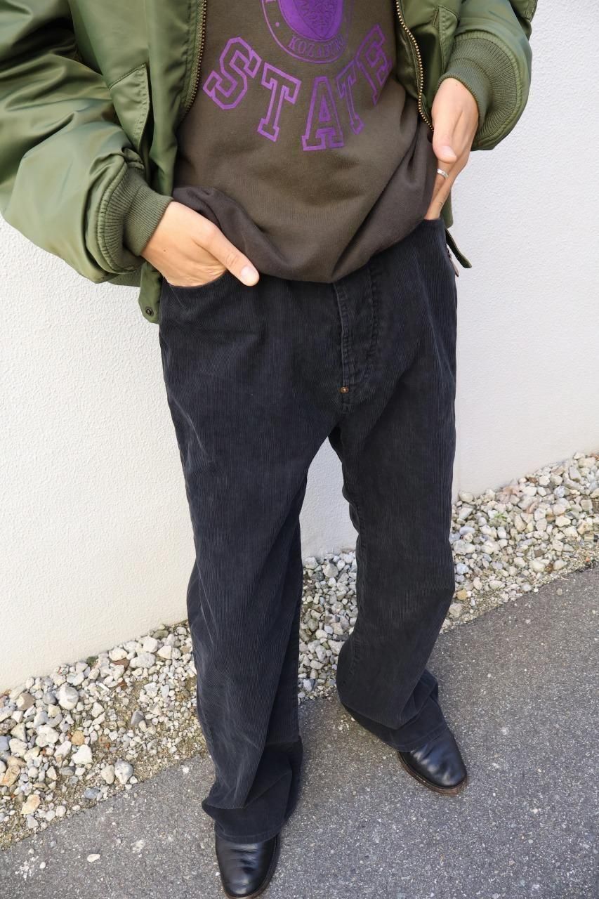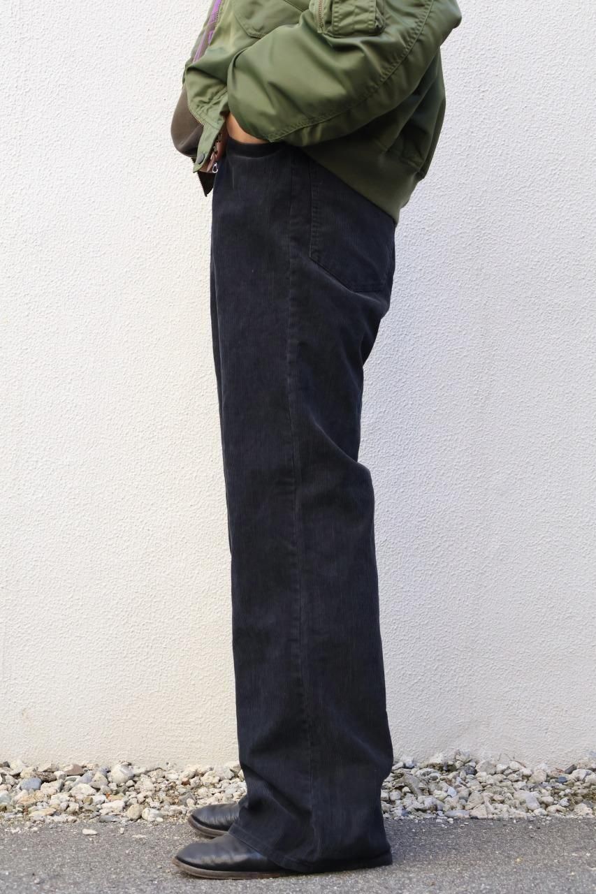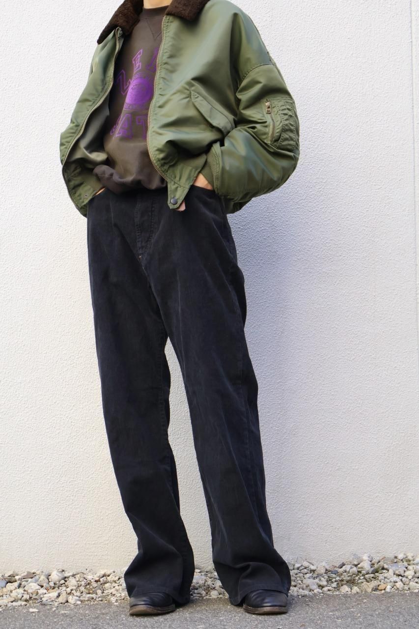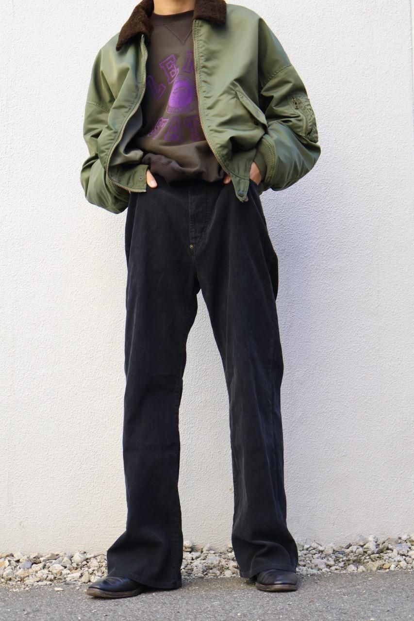 スラブ糸を使用したコーデュロイに硫化染めを施し、独特の色合いとムラ感を表現。さらに製品加工でストーンバイオを施すことで、程よくこなれた風合いに仕上げている。