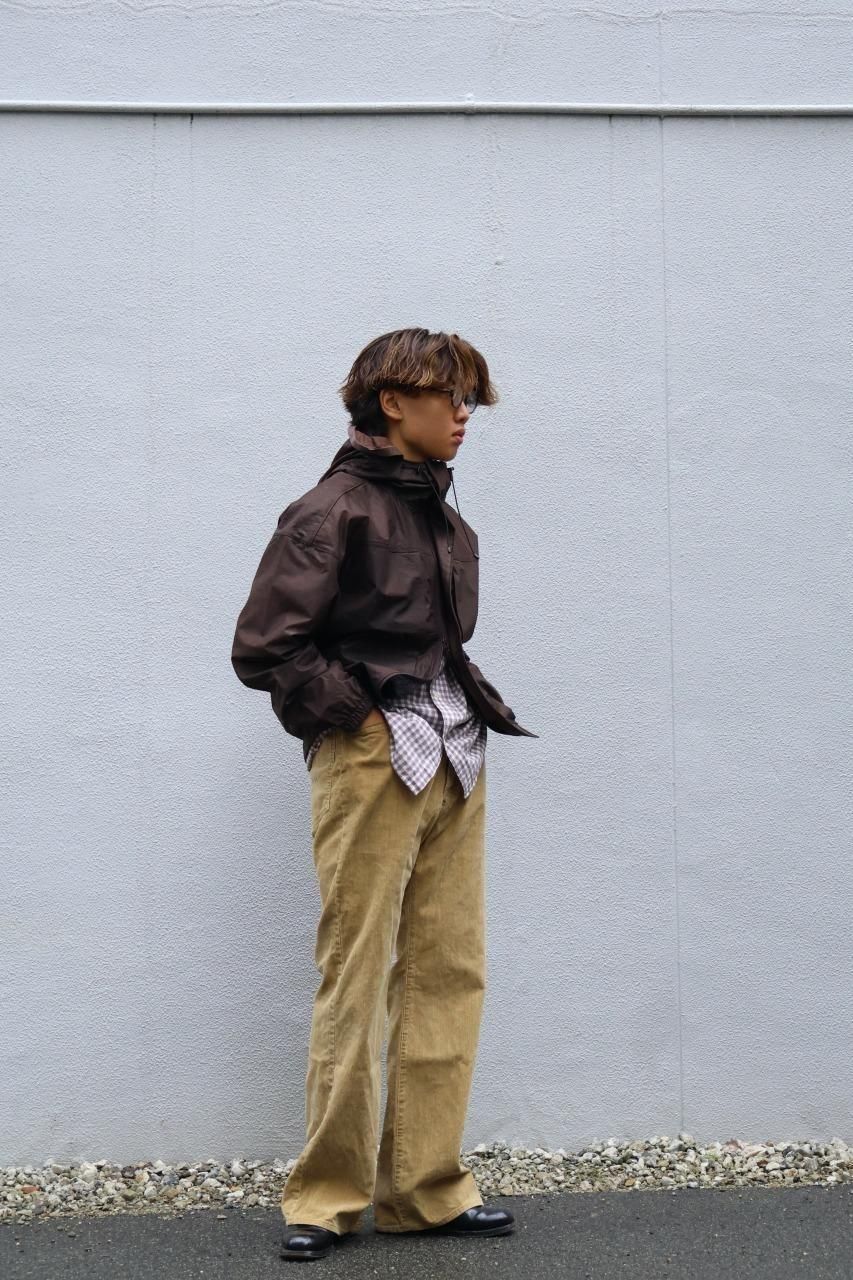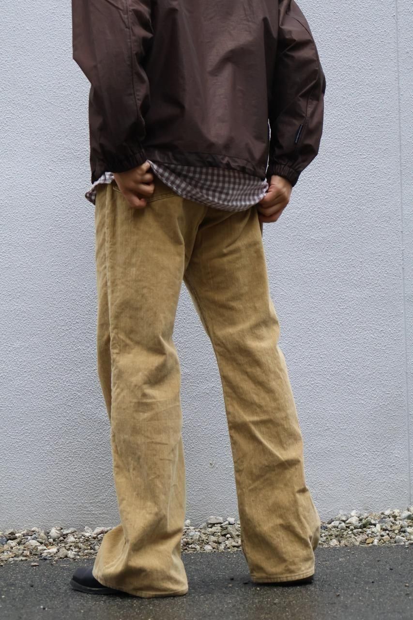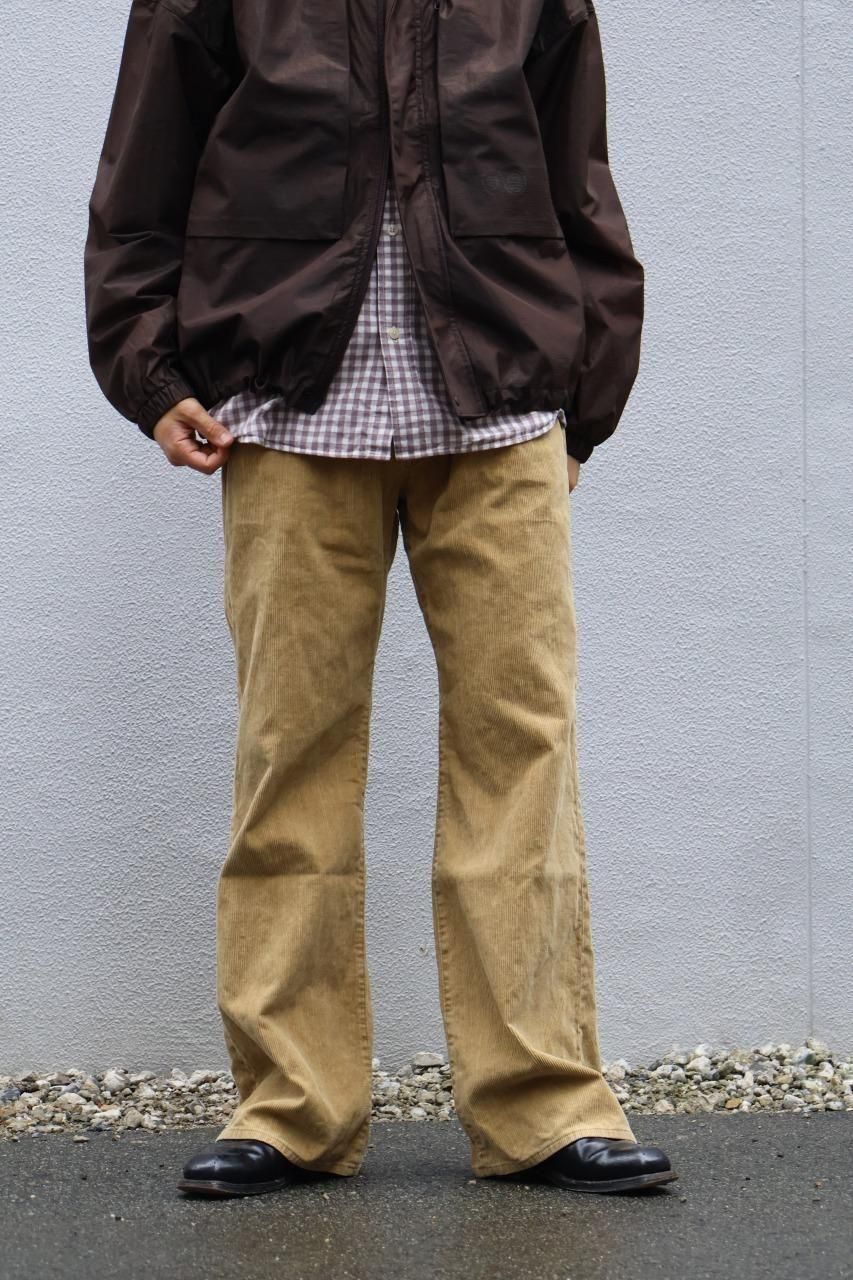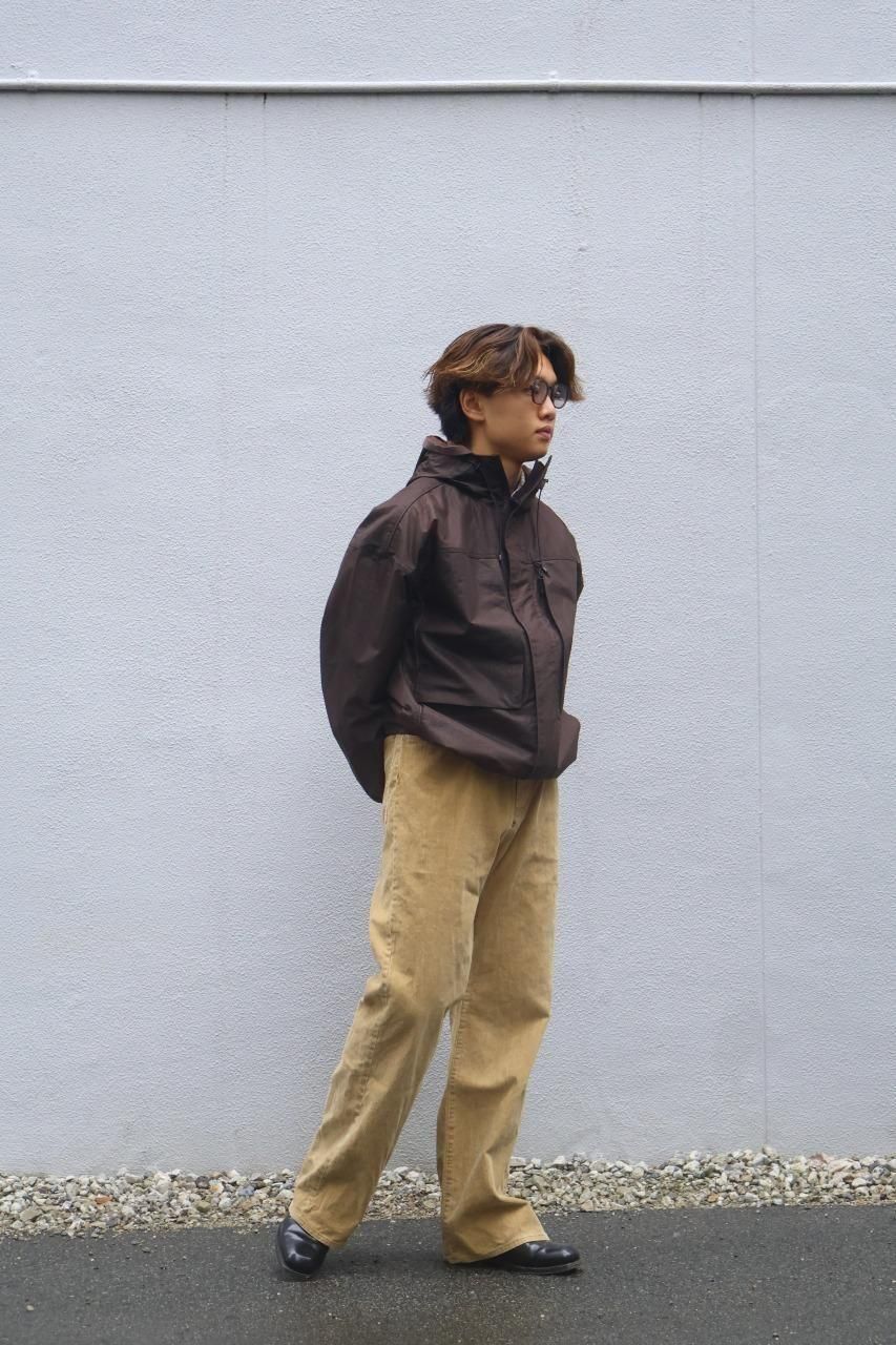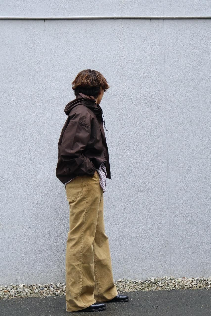 スラブ糸を使用したコーデュロイに硫化染めを施し、独特の色合いとムラ感を表現。さらに製品加工でストーンバイオを施すことで、程よくこなれた風合いに仕上げている。