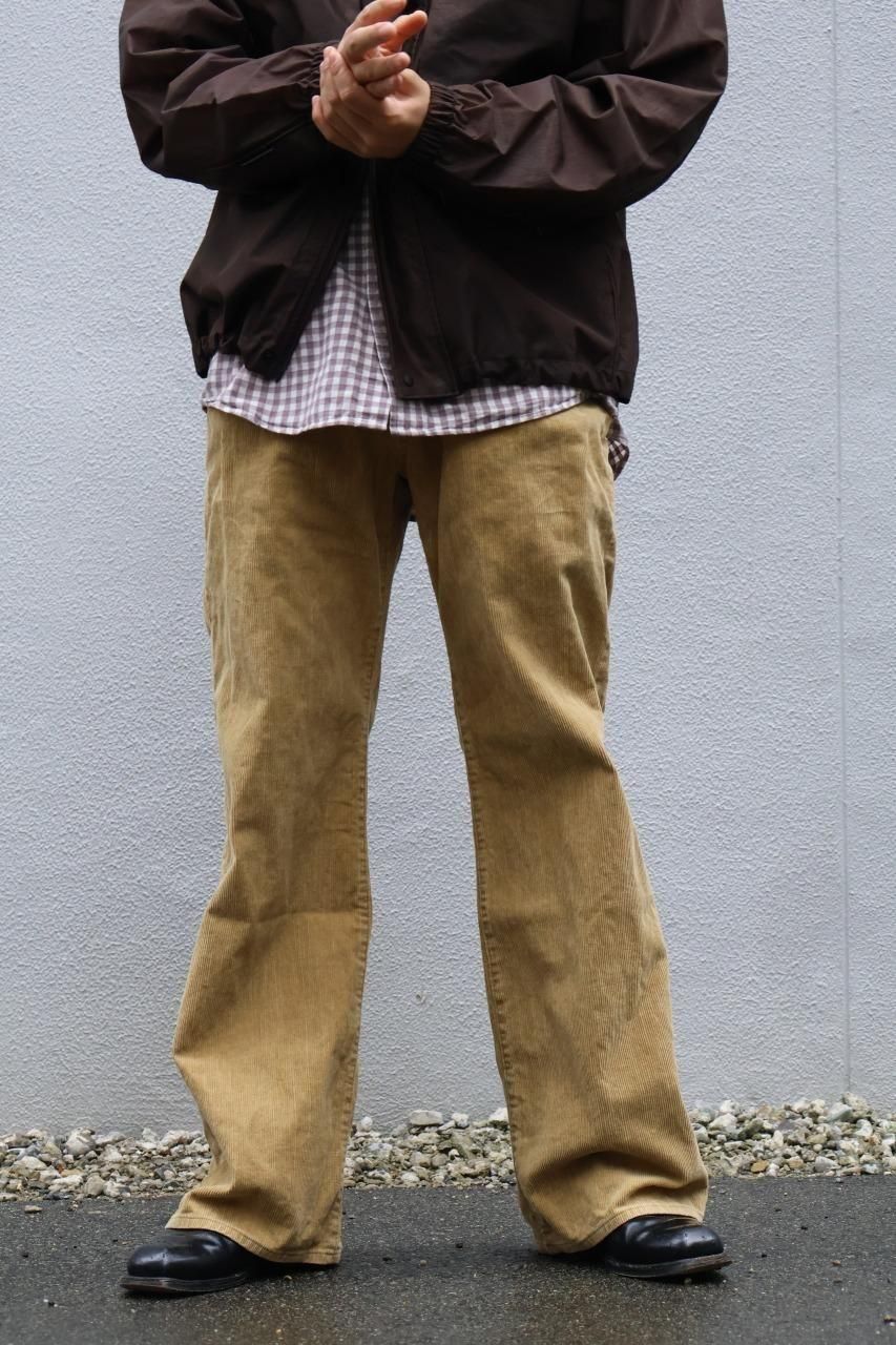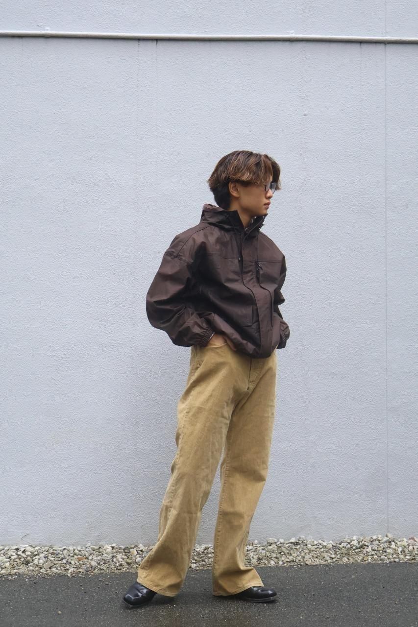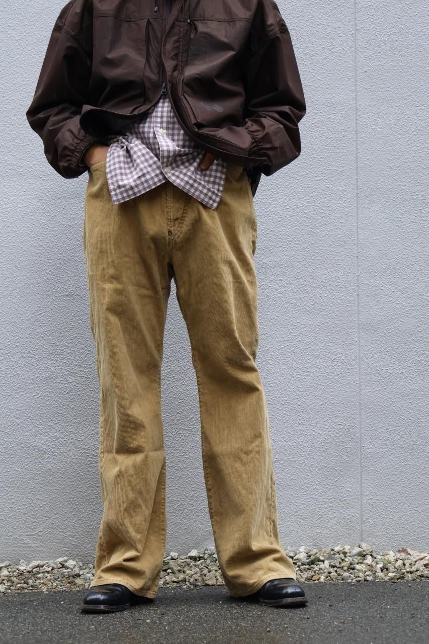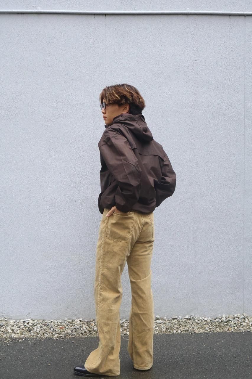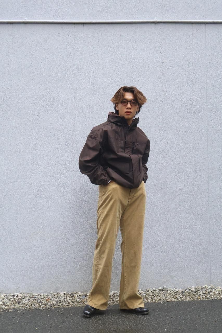 スラブ糸を使用したコーデュロイに硫化染めを施し、独特の色合いとムラ感を表現。さらに製品加工でストーンバイオを施すことで、程よくこなれた風合いに仕上げている。