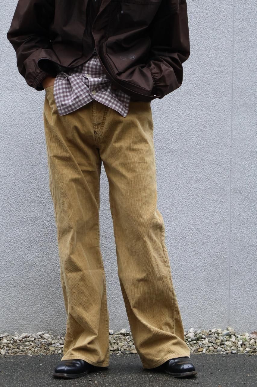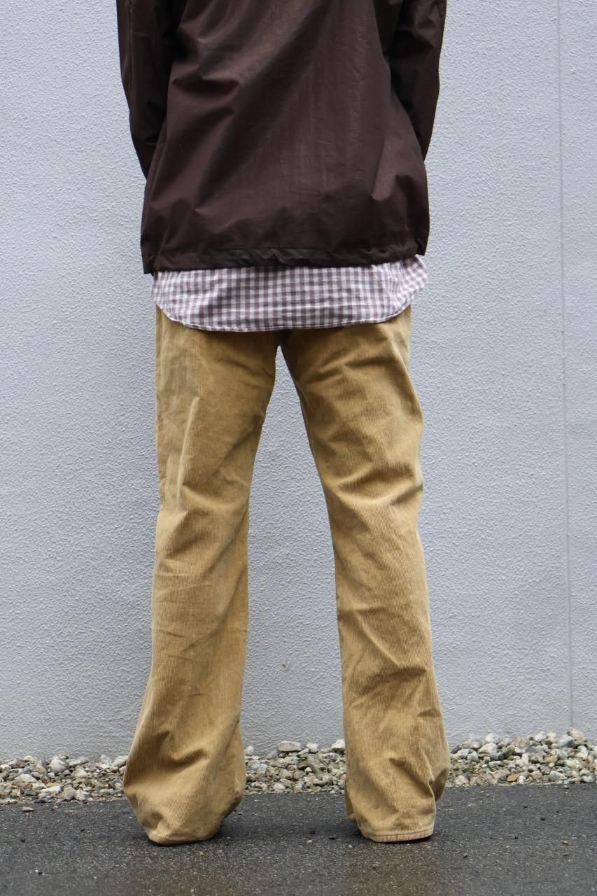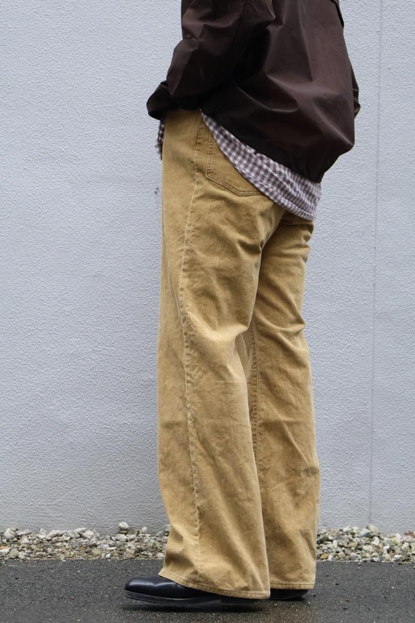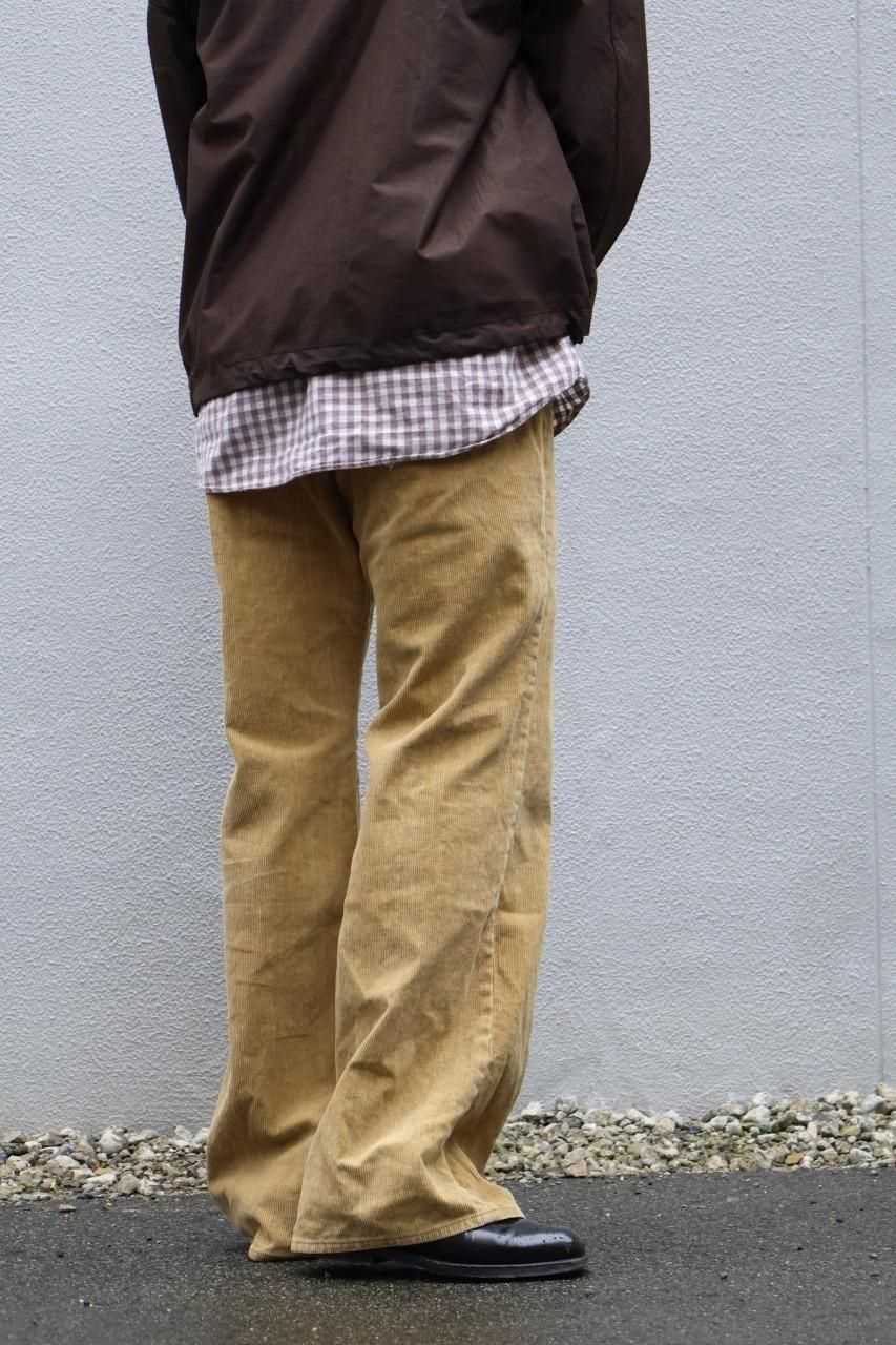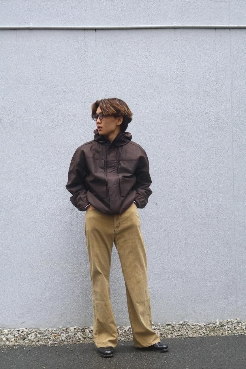 スラブ糸を使用したコーデュロイに硫化染めを施し、独特の色合いとムラ感を表現。さらに製品加工でストーンバイオを施すことで、程よくこなれた風合いに仕上げている。