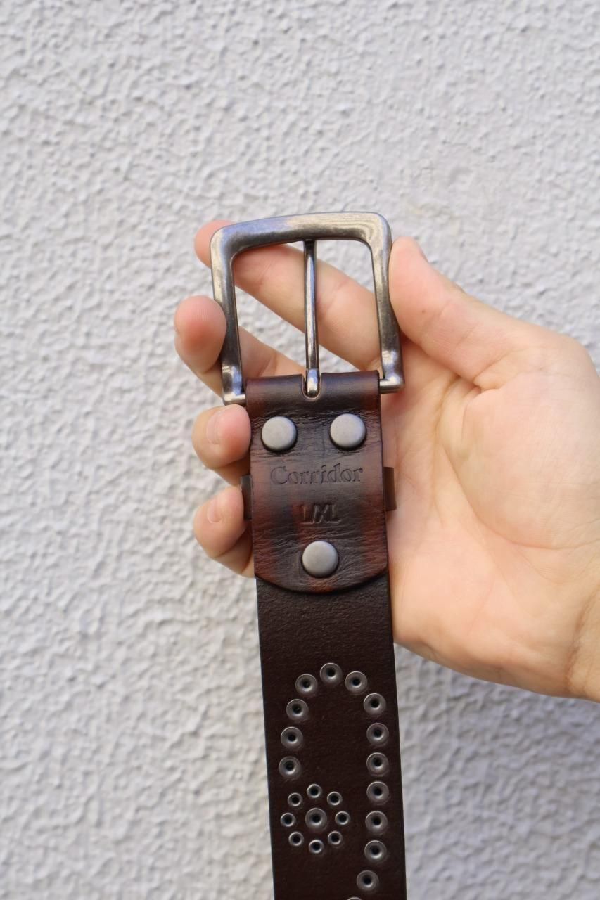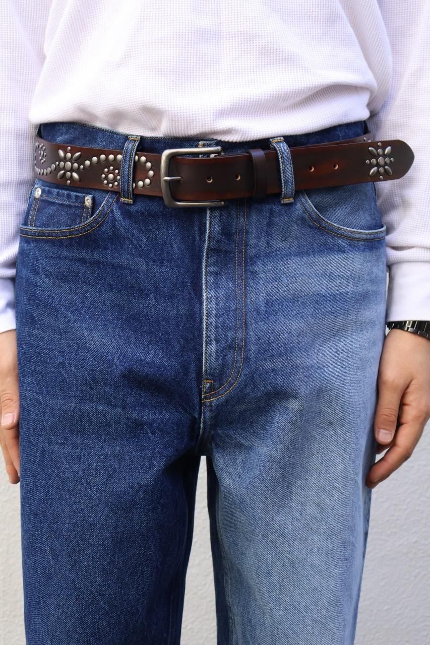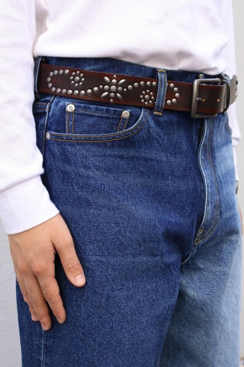 アンティークシルバーのスタッズと、艶消し加工の金具がアクセントになった、フルグレインレザーベルト。